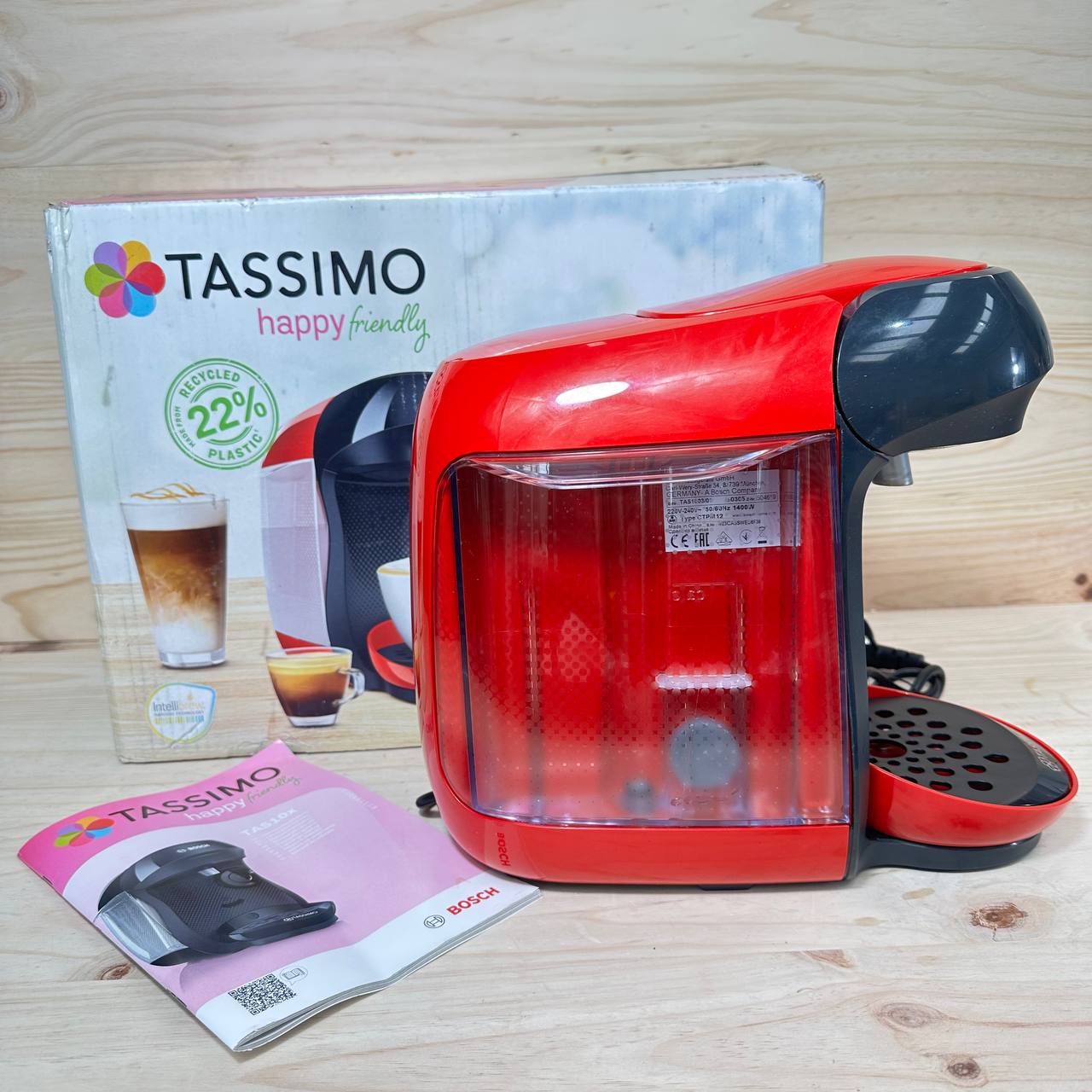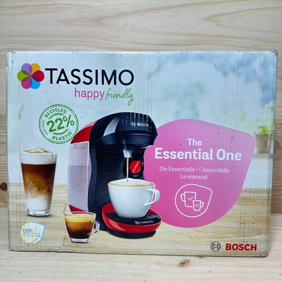 Cafetera Bosch Tassimo Happy Friendly TAS103E (como nueva, sin defectos). Capaz de preparar hasta 70 bebidas con un solo toque gracias a su tecnología INTELLIBREW™, en un elegante color rojo que aporta un toque moderno a tu cocina.