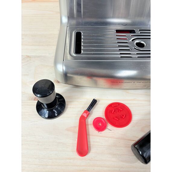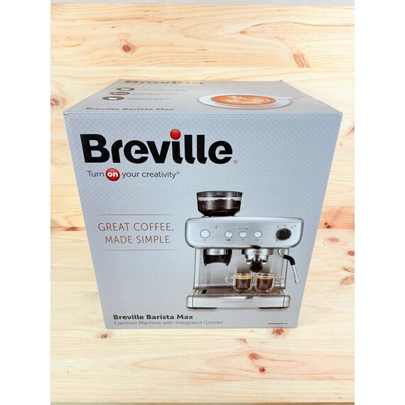 Breville Barista Max máquina de café expreso [VCF126X] en estado como nuevo (pequeños rasguños visibles en la foto). Totalmente automática, cuenta con un molinillo integrado y una bomba italiana de 15 bares, ideal para preparar café de calidad profesional en casa.