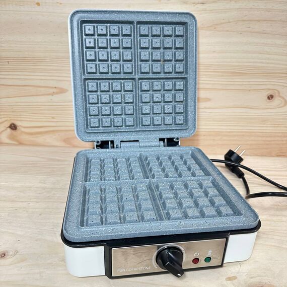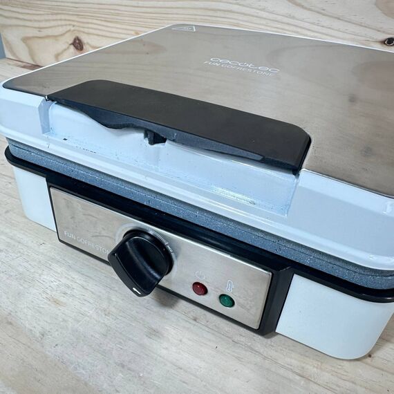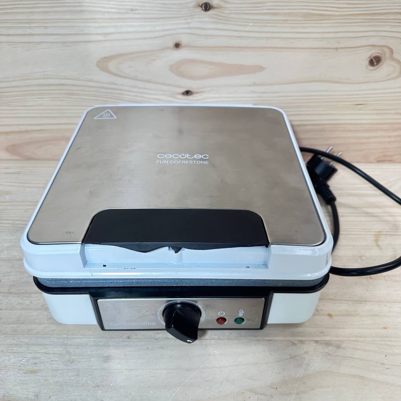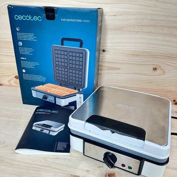 Cecotec Gofrera Eléctrica Fun Gofrestone 4Inox de 1200 W (como nuevo, pequeño detalle: tiene el asa rota que no afecta funcionamiento). Capacidad para preparar 4 gofres a la vez, fabricada en acero inoxidable y con revestimiento antiadherente Rockstone, además de temperatura ajustable.