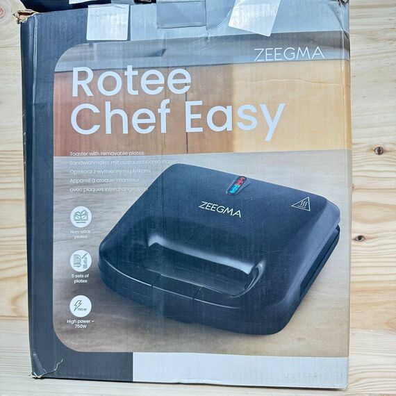 ZEEGMA ROTEE CHEF EASY Tostadora Multifuncional 750 W 5 en 1 (como nuevo, sin defectos). Ideal para tostar pan, hacer waffles, sandwiches y galletas. Equipado con placas antiadherentes y protección contra el sobrecalentamiento.