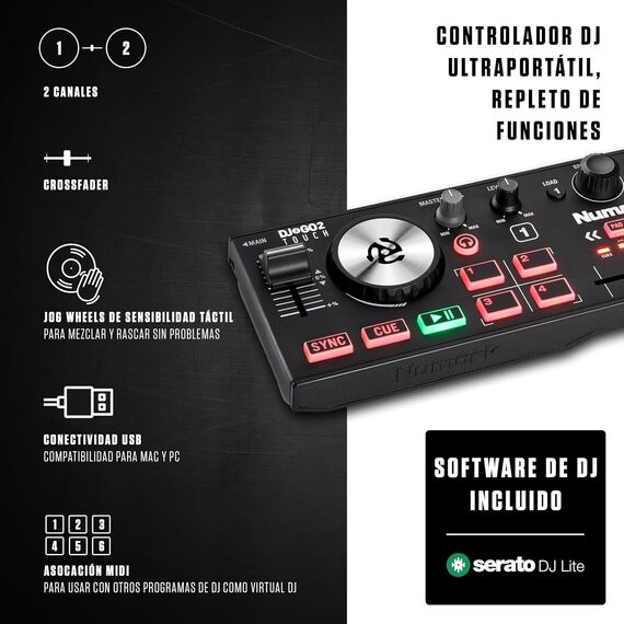 Numark DJ2GO2 Touch – Controladora DJ USB compacta de 2 canales con jog wheels táctiles, mezclador, interfaz de audio y Serato DJ Lite