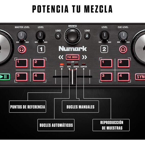 Con solo 33 cm de ancho, ofrece todo lo necesario para mezclar: crossfader, ecualización, control de pitch, pads y jog wheels táctiles, ideales para hacer scratch con precisión.