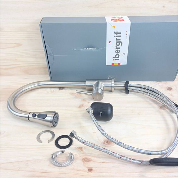 Grifo de Cocina Ibergrif M22137, en estado como nuevo y sin defectos. Fabricado en acero inoxidable 304, cuenta con un diseño moderno y funcional, con un giro de 360° y 3 modos de agua.