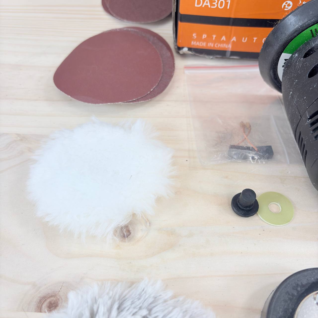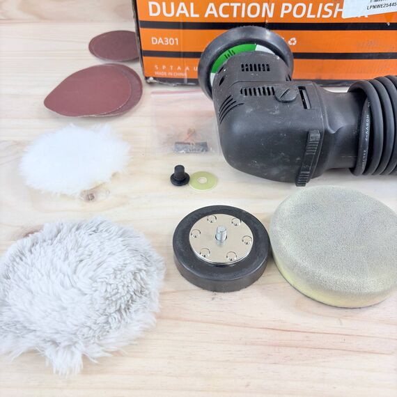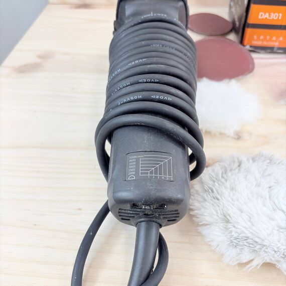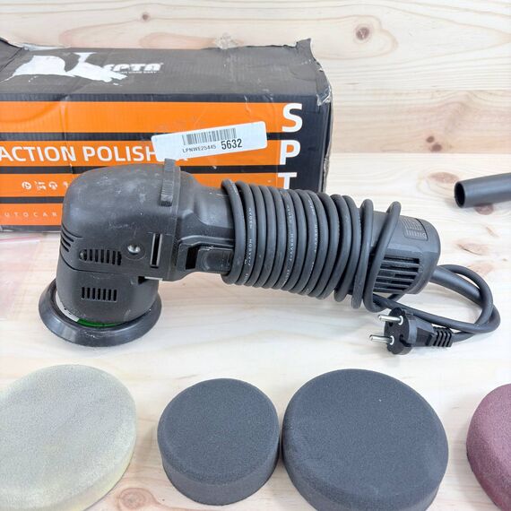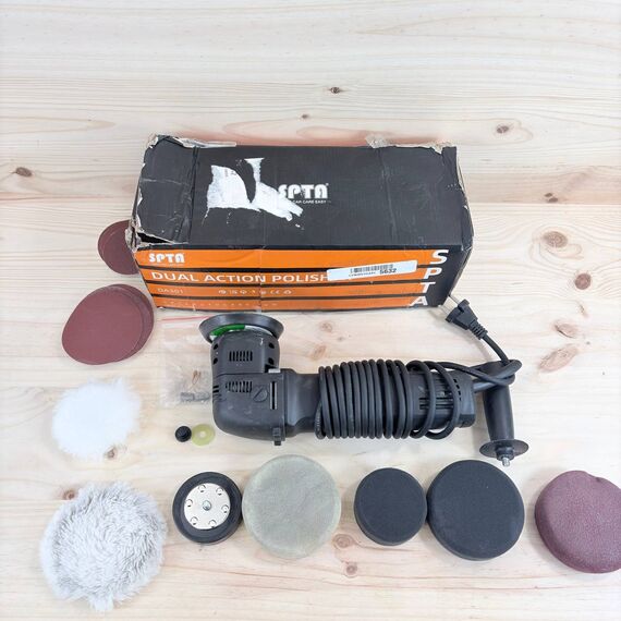Pulidora de búfer SPTA, modelo de 3 pulgadas, en estado como nuevo (pequeño detalle: ligeras señales de uso, falta llave para cambiar cabezal). Potencia de 780 W y doble acción con órbita de 10 mm, ideal para un acabado profesional.