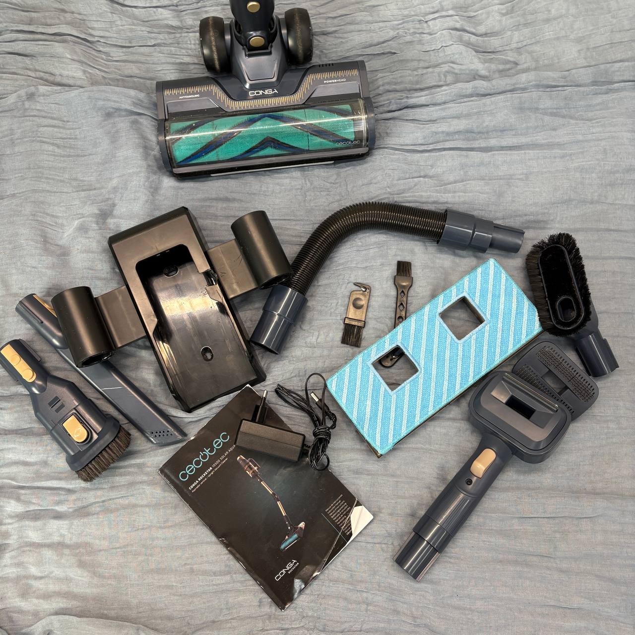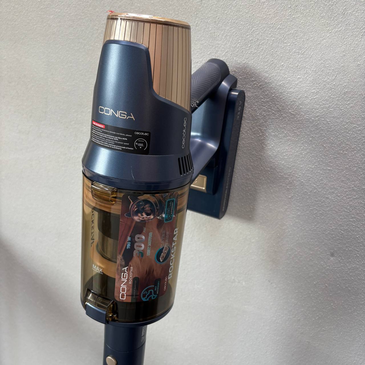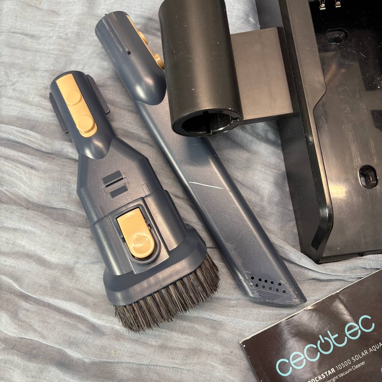 Aspiradora Escoba sin Cable Cecotec Conga Rockstar 10500 Solar AquaPet Flex (buen estado, pequeño detalle estético en la base de carga cerca de la manija). Potencia de 780W y máxima succión de 300AW, con 100 minutos de autonomía. Incluye cepillo Hairless antienredos, tubo flexible y un completo kit de accesorios.