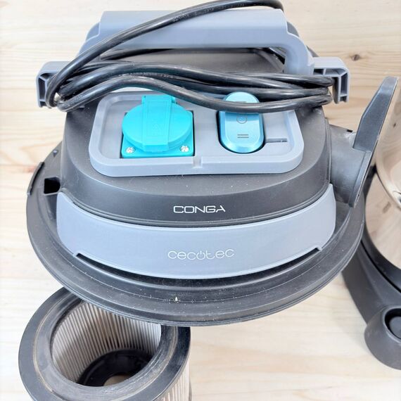 Aspirador de Sólidos y Líquidos de Metal con Cable Cecotec Conga Rockstar Wet & Dry Steel Pro Tool de 30L (como nuevo, pequeño detalle: filtro usado, resto de componentes en buen estado). Potente motor de 1600W, diseñado para mayor durabilidad y resistencia, incluye enchufe para herramientas y kit de accesorios.
