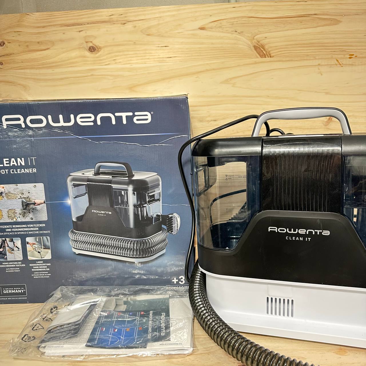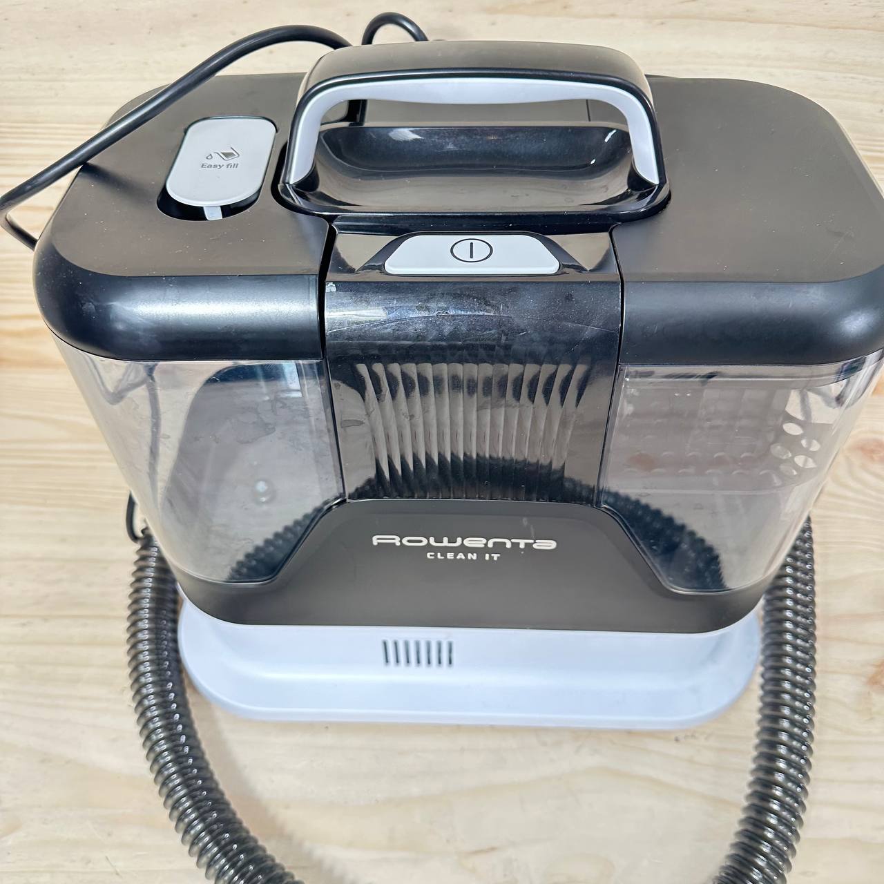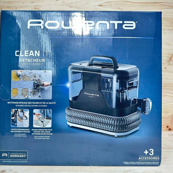 Aspirador de tapicerías multiuso Rowenta Clean It IN5010 (nuevo, sin defectos). Equipado con un gran depósito extraíble de 1,8 L de agua limpia y 1,5 L de agua residual, ofrece un diseño compacto y eficiente con una potencia de 400 W y una succión de 12,5 kPa.