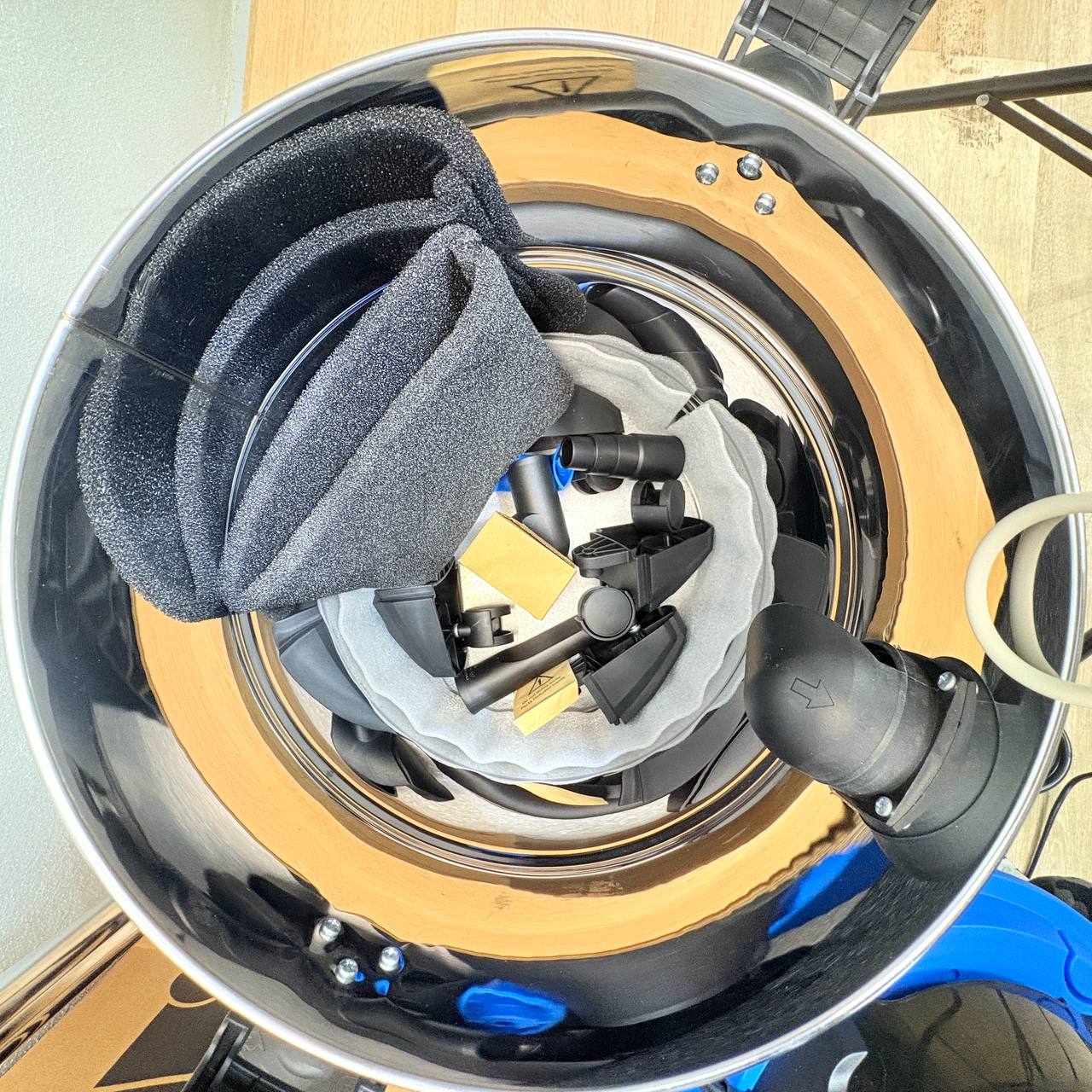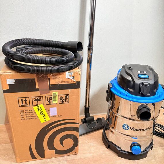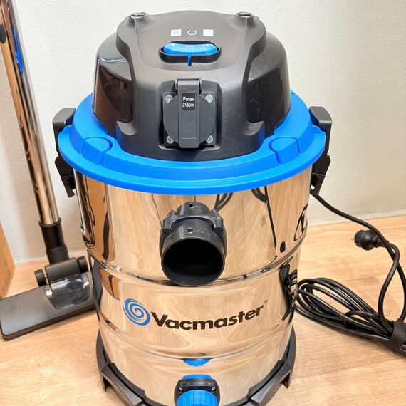 Aspirador Vacmaster VQ1530SFDC de 1500W (nuevo, sin defectos). Capacidad de 30L, fabricado en acero inoxidable, con función de soplador y toma de corriente para herramientas eléctricas.