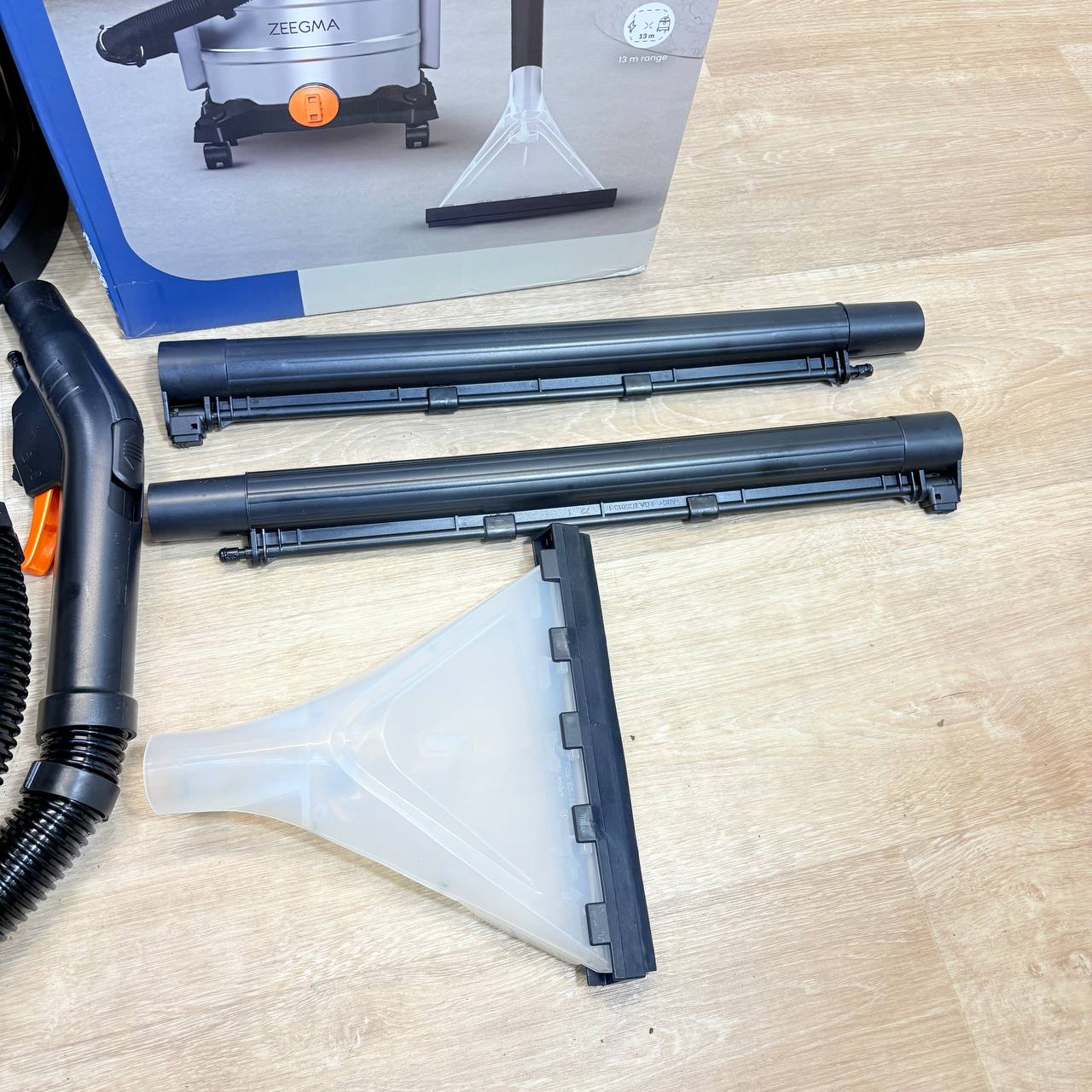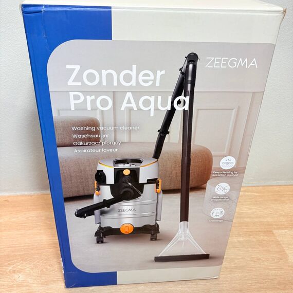 Aspirador Zeegma ZONDER Pro Aqua de 1400 W (como nuevo, sin defectos). Ideal para limpieza en seco y húmedo, cuenta con un depósito de agua limpia de 4 L y un completo juego de filtros y boquillas de lavado.