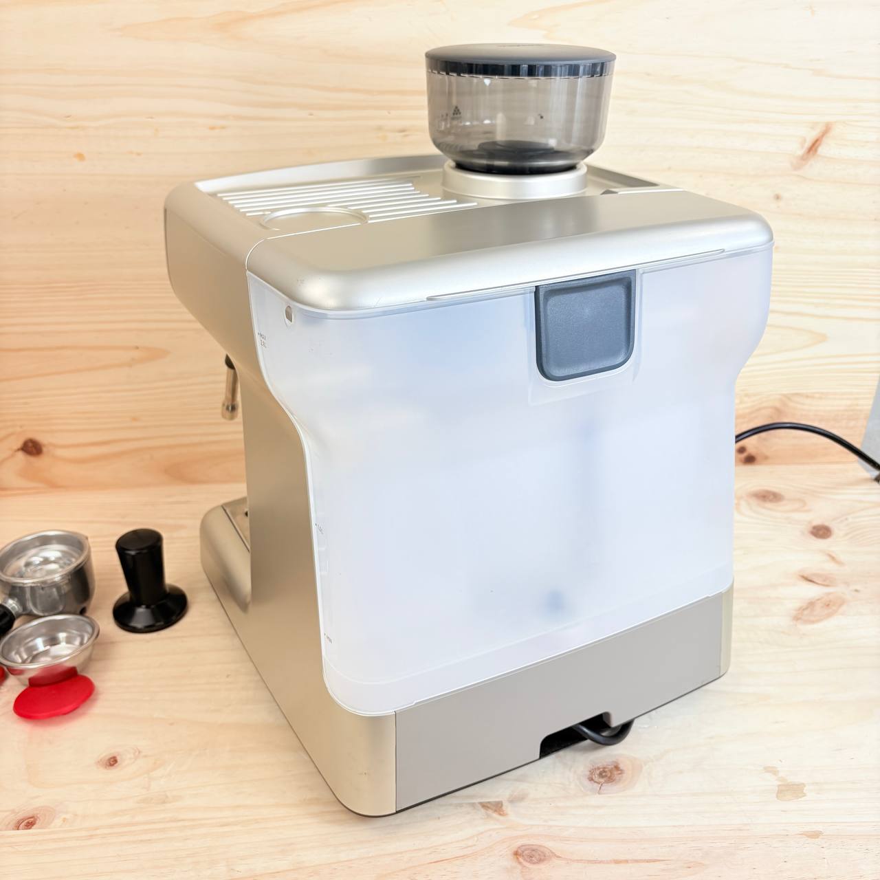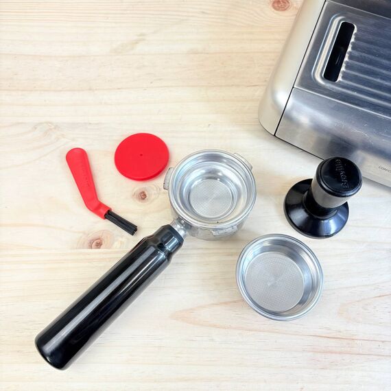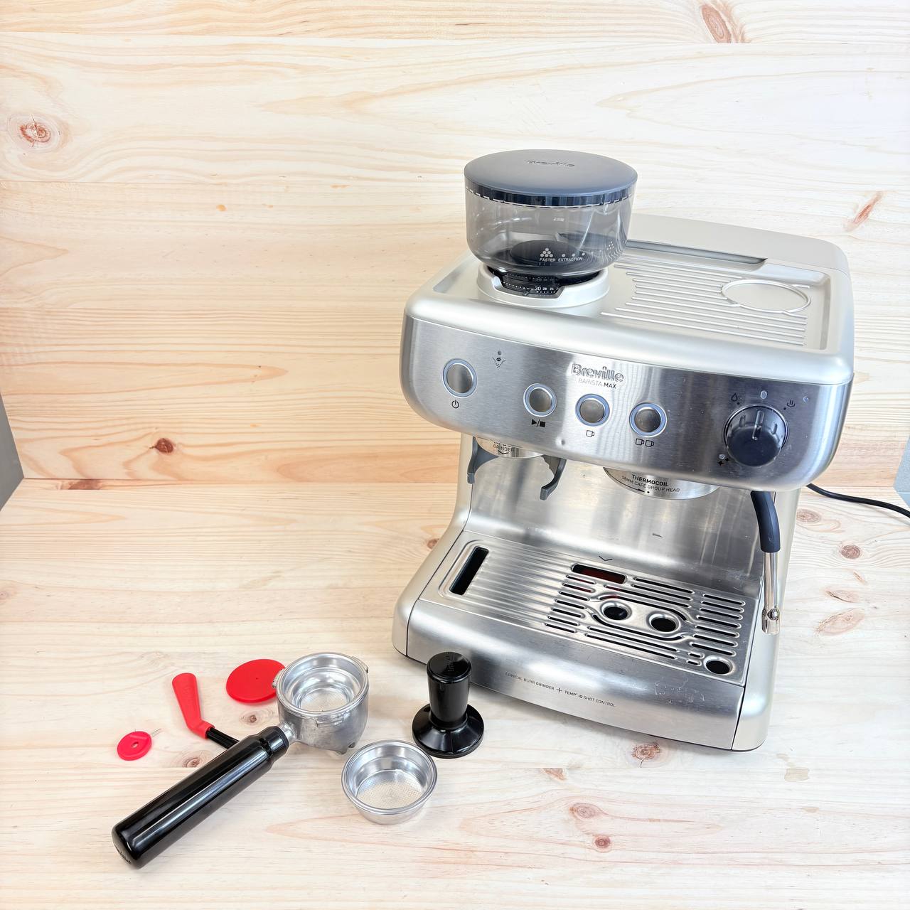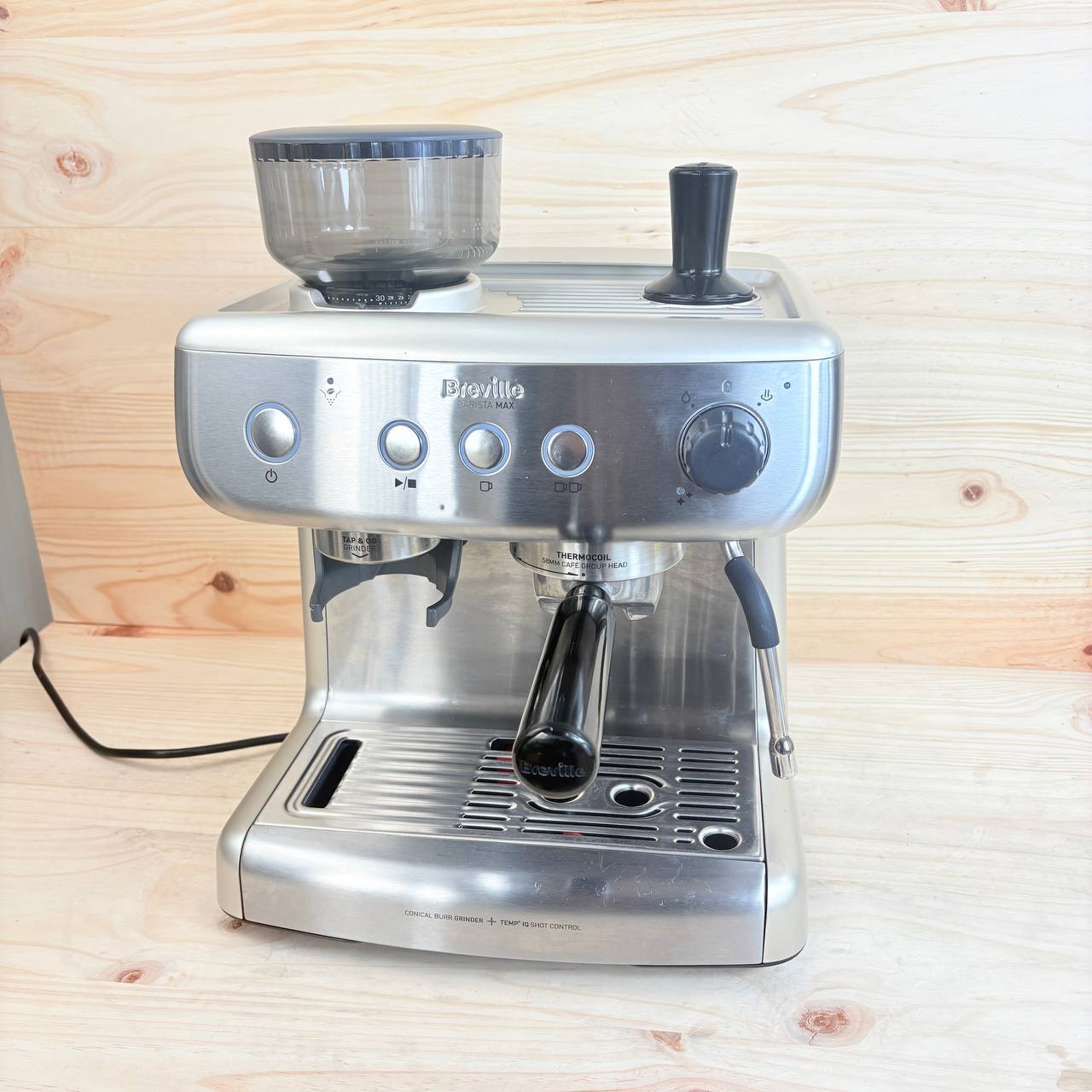 Máquina de café expreso Breville Barista Max [VCF126X] en estado como nuevo (pequeño detalle: sin caja original, leves marcas de uso). Cuenta con un molinillo integrado y bomba italiana de 15 bares para una extracción perfecta.