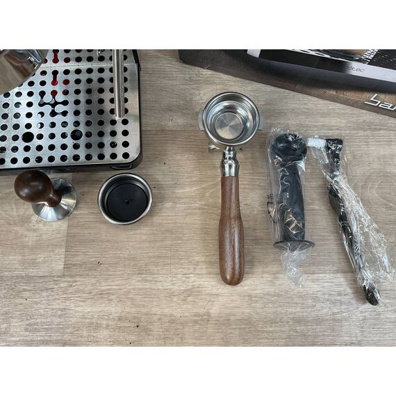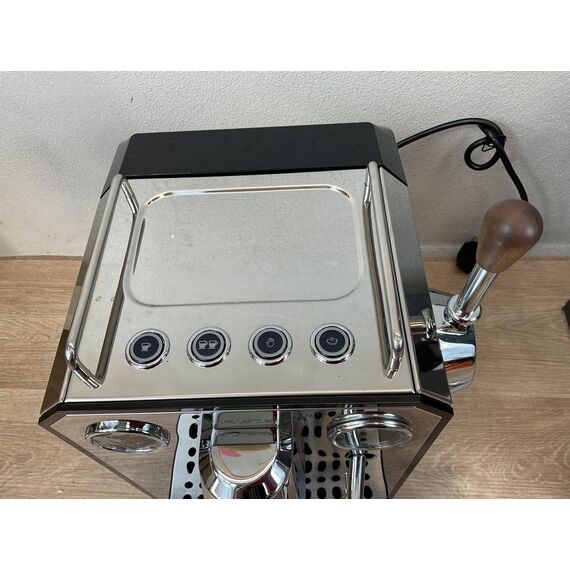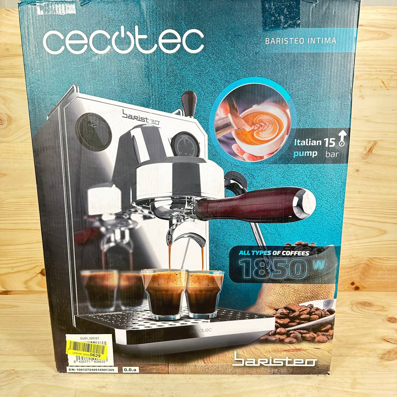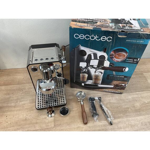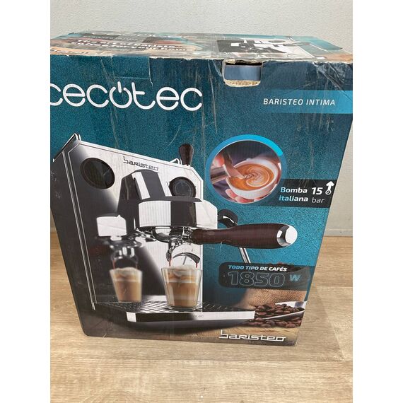 Cafetera Express Cecotec Barista Baristeo Intima (como nuevo, sin defectos). Ofrece una potencia de 850W y capacidad para 1.5L, ideal para preparar hasta 10 tazas de café. Cuenta con un sistema de presión de 15 bares y un vaporizador para espumar leche.