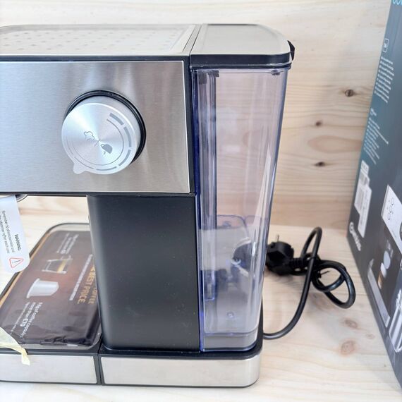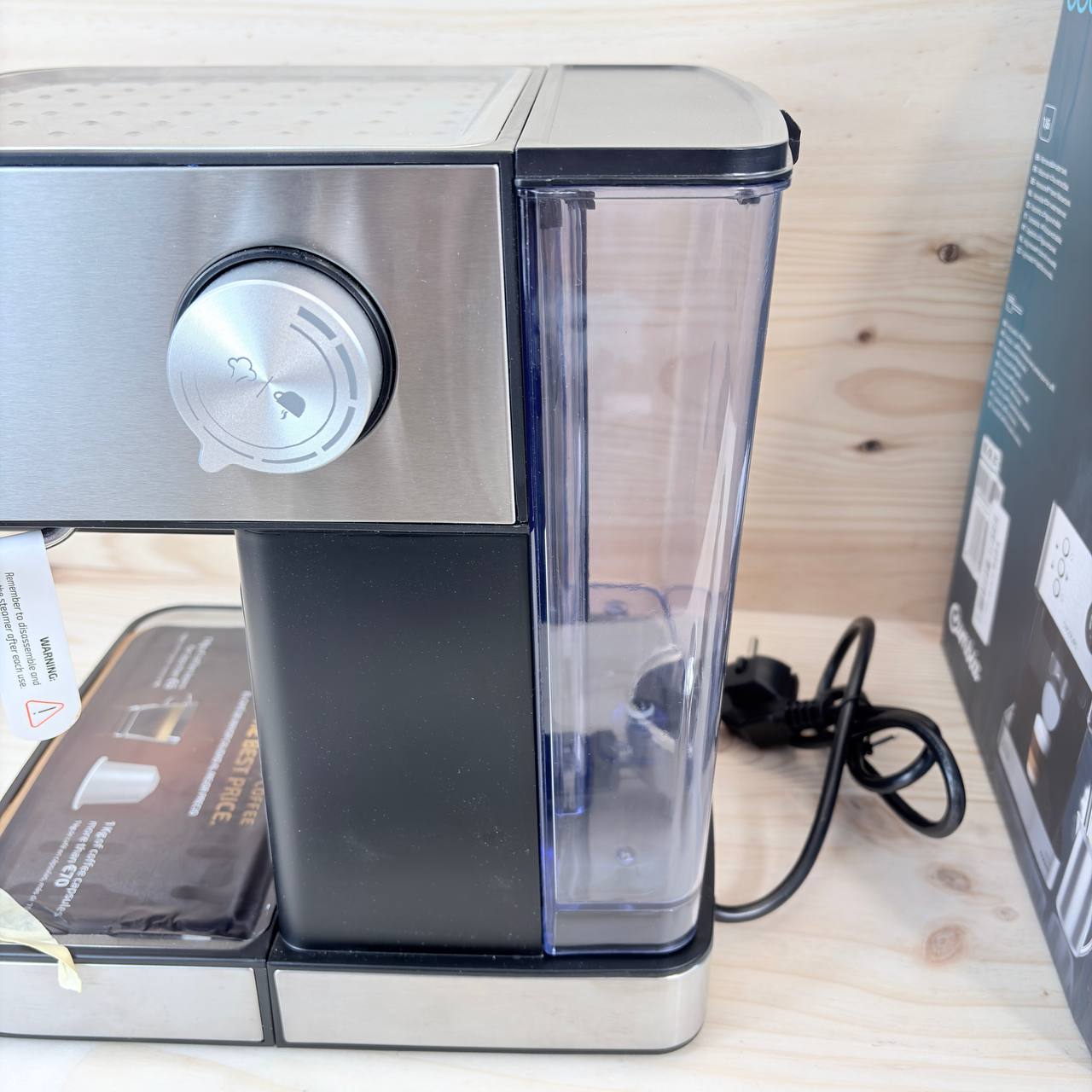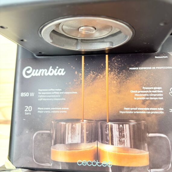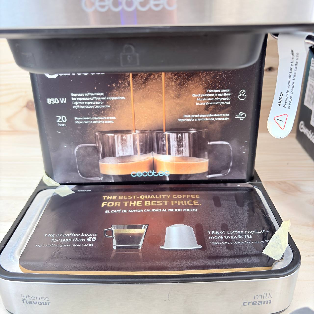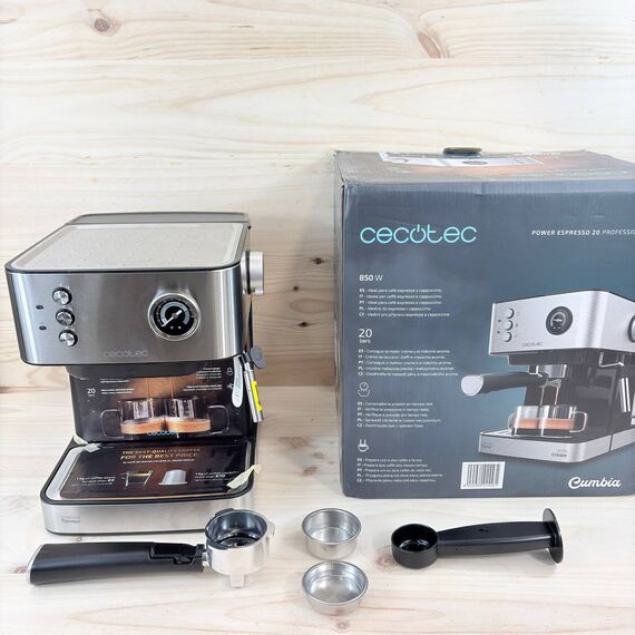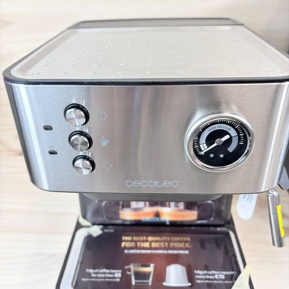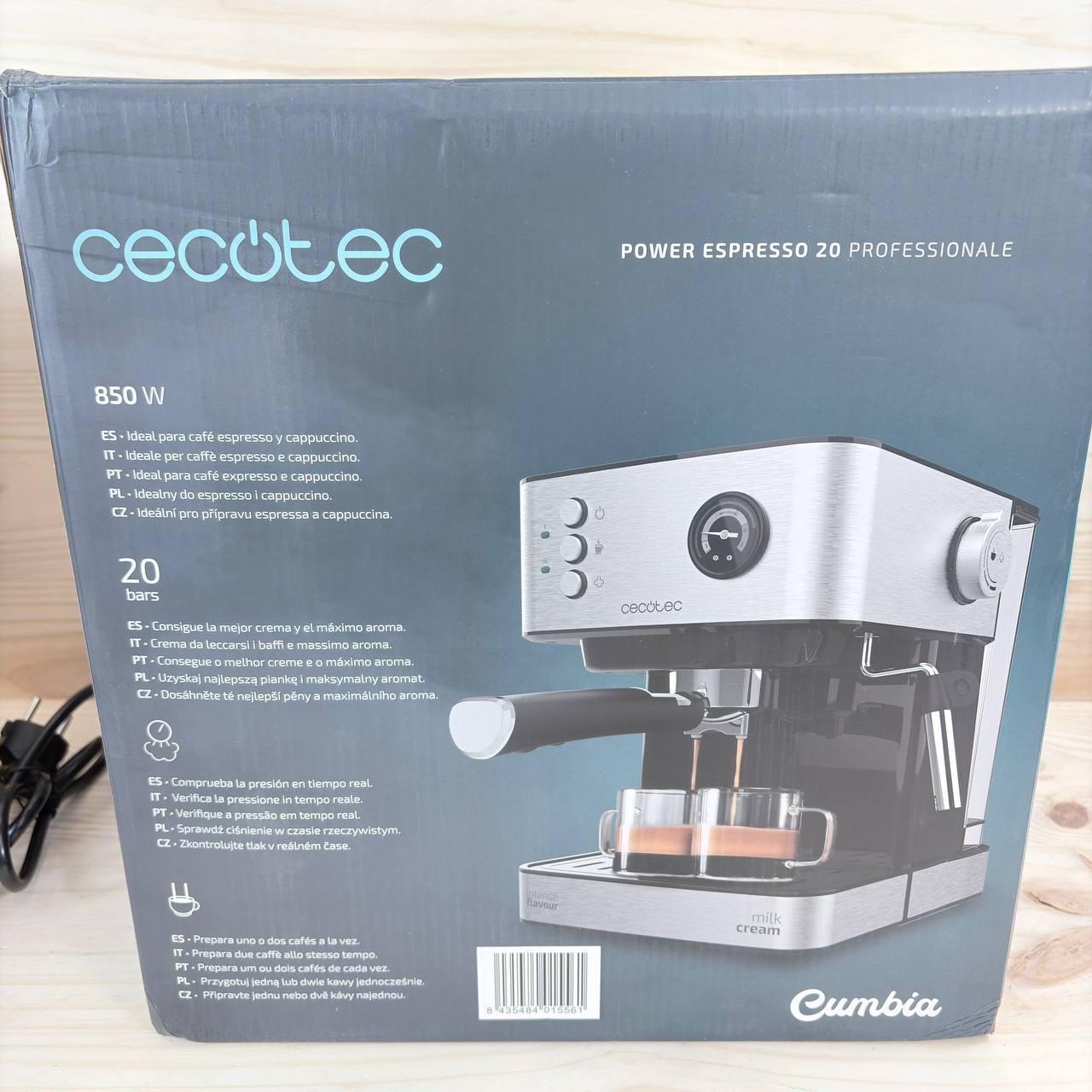 Cafetera Express Cecotec Power Espresso 20 Professionale de 850W (nuevo, ligeras señales de uso para prueba). Cuenta con 20 bares de presión, manómetro, depósito de 1,6L y un brazo de doble salida.