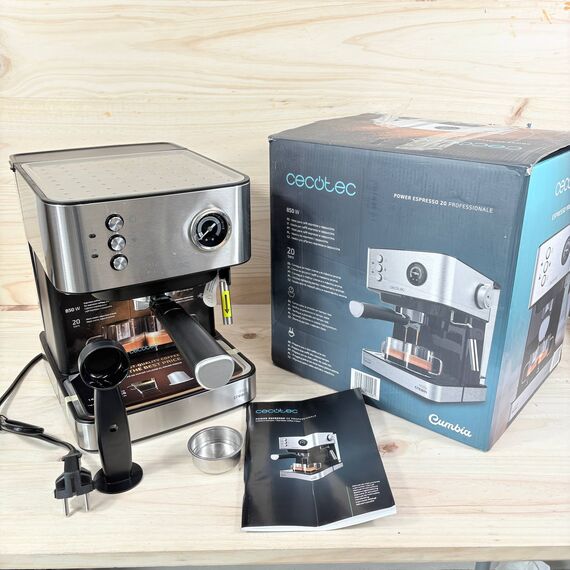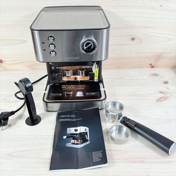 Cafetera Express Cecotec Power Espresso 20 Professionale (como nuevo, sin defectos). Potente motor de 850W y 20 bares de presión, cuenta con un manómetro para controlar la presión del café, depósito de 1,6L y brazo de doble salida para preparar dos tazas simultáneamente. Incluye vaporizador y superficie calientatazas con acabados en acero inoxidable.