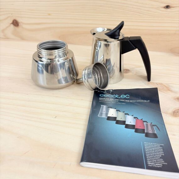 Cafetera Italiana Cecotec Piccolina 200, 100ml, 2 Tazas de Café (como nueva, pequeño detalle: sin embalaje original). Fabricada en acero inoxidable, apta para todas las superficies, con filtro premium y válvula de seguridad. Mango termorresistente y diseño elegante.