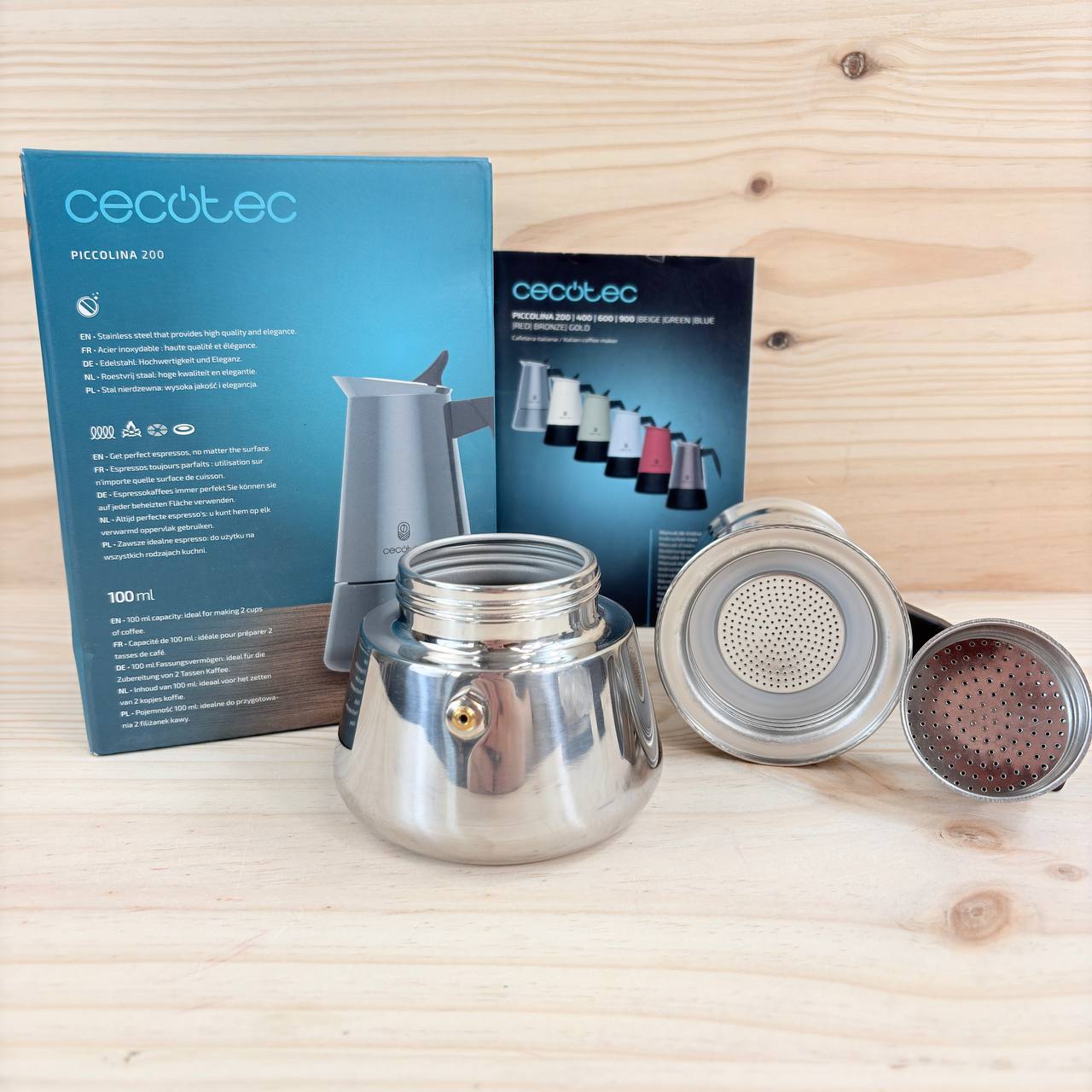 Cafetera Italiana Cecotec Piccolina 200 de 100ml, 2 tazas de café (nuevo, sin defectos). Fabricada en acero inoxidable, apta para todas las superficies, cuenta con filtro premium y válvula de seguridad. Su mango termorresistente y diseño elegante la hacen perfecta para cualquier cocina.