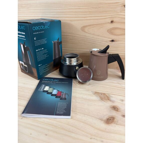 Cafetera Italiana Cecotec Piccolina 200 Bronze (nuevo, sin defectos). Capacidad de 100ml, ideal para preparar 2 tazas de café, fabricada en acero inoxidable y apta para todas las superficies. Incluye filtro premium y válvula de seguridad, además de un mango termorresistente que garantiza comodidad durante su uso.