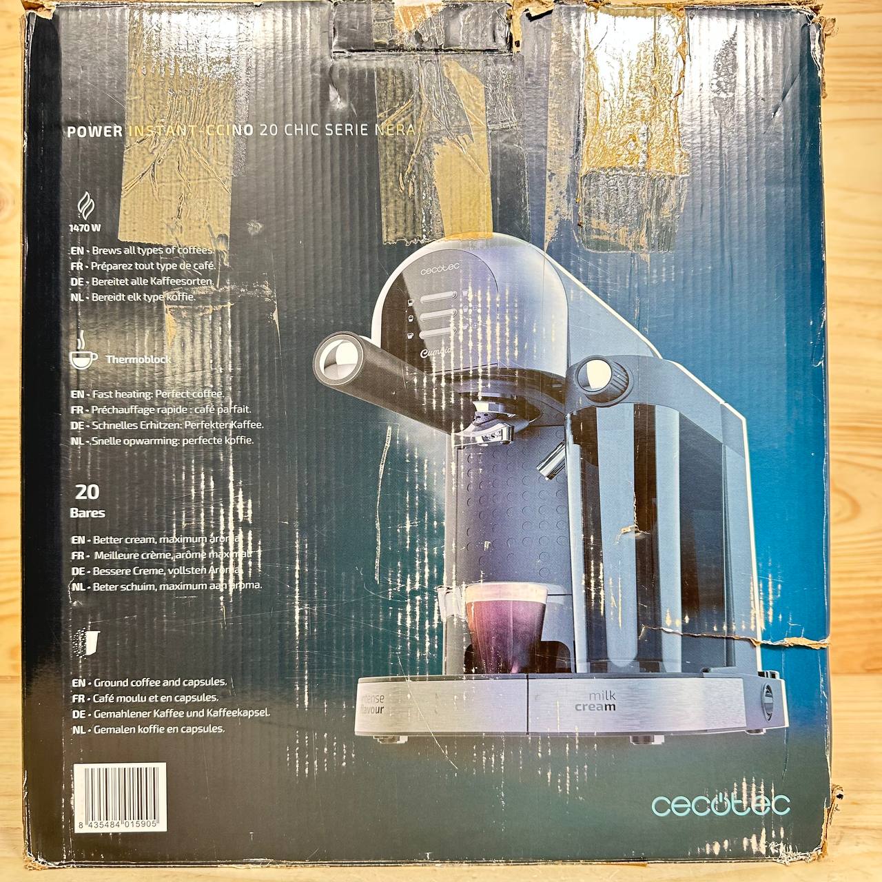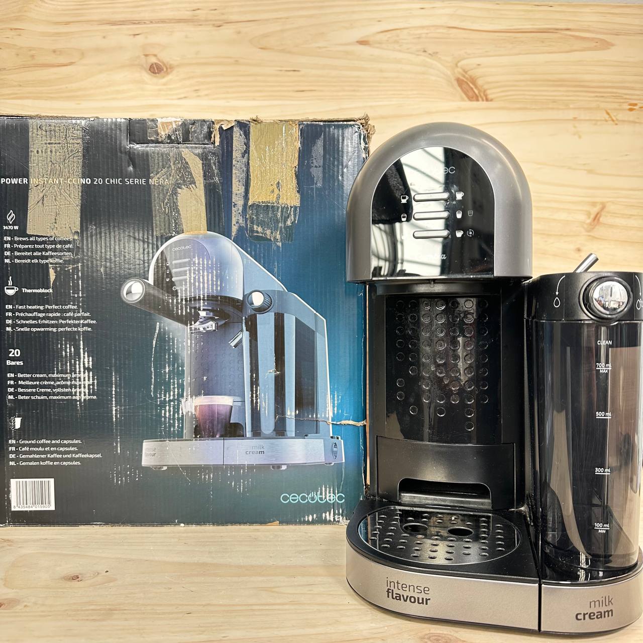 Cafetera Semiautomática Cecotec Power Instant-ccino 20 Chic Serie Nera (como nueva, pequeño detalle: el difusor de la leche está roto). Diseñada para café molido y en cápsulas, cuenta con 20 bares de presión, un depósito de leche de 0.7L y un depósito de agua de 1.7L, todo con una potencia de 1470W.