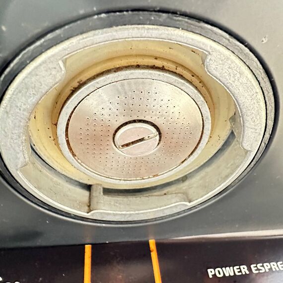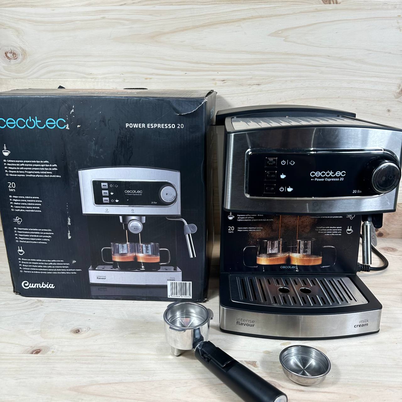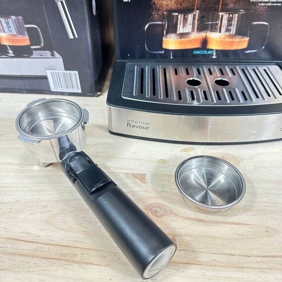 Cafetera Cecotec Machine à café Express Power Espresso 20 Barista Pro (en condiciones aceptables, pequeño detalle: rotura en la carcasa lateral bastante visible, no afecta al funcionamiento). Equipado con 2 thermoblocks, 20 bares de presión, manómetro y modo automático para preparar 1 o 2 cafés a la vez. Potente motor de 2900W.
