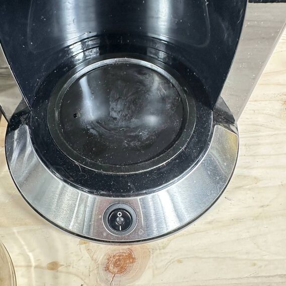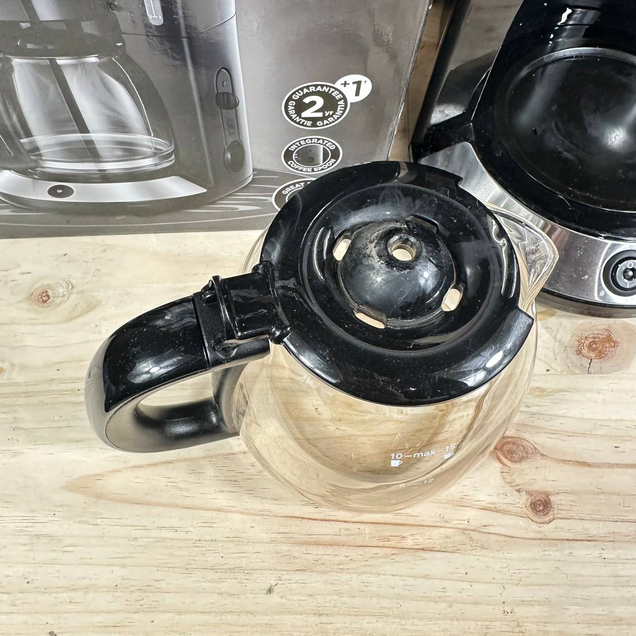 Cafetera Russell Hobbs 24010-56 Adventure en buen estado (pequeño detalle: marcas de uso). Capacidad para 10 tazas grandes o 15 pequeñas, potencia de 1100 W y 1.25 litros de capacidad. Fabricada en acero inoxidable mate, con un diseño elegante en negro.