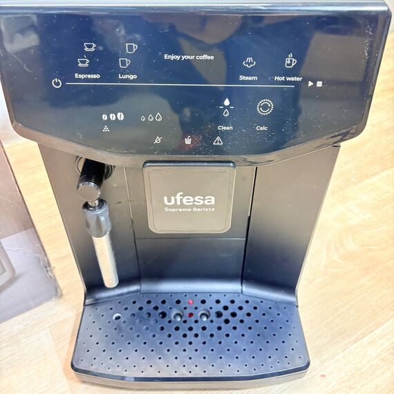 Cafetera Superautomática Ufesa Supreme Barista de 1550W (buen estado, pequeño detalle: pequeñas marcas de uso). Cuenta con 20 bares de presión, panel táctil intuitivo y molinillo incorporado, además de tecnología patentada para ajustar el grosor del café.