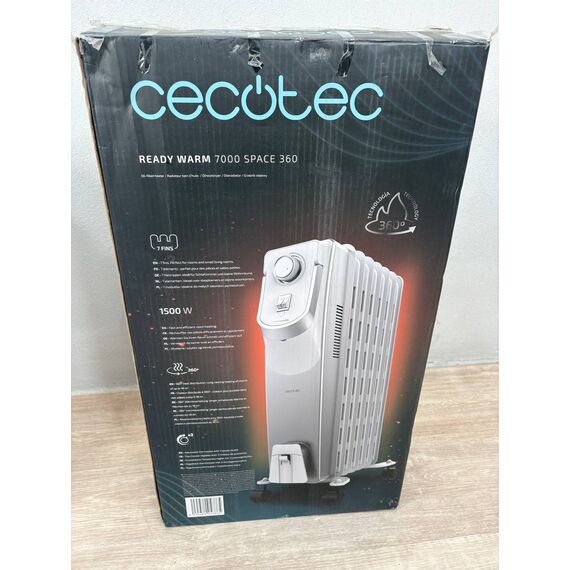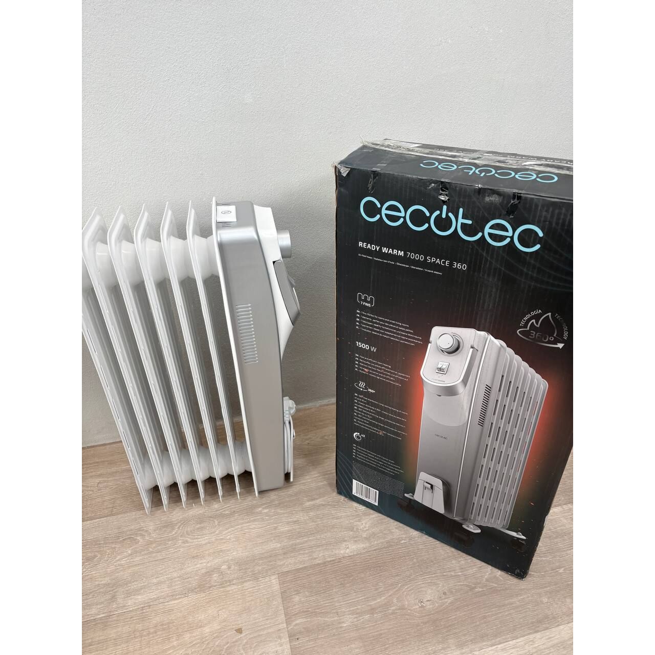 Cecotec Radiador Eléctrico de Aceite ReadyWarm 7000 Space 360 (como nuevo, sin defectos). Cuenta con 7 módulos y una potencia de 1500 W, ideal para calentar espacios de hasta 18 m². Incorpora 3 niveles de temperatura y un práctico recogecables.