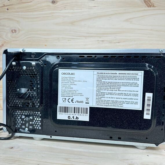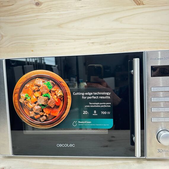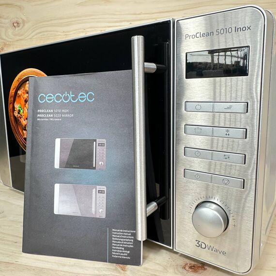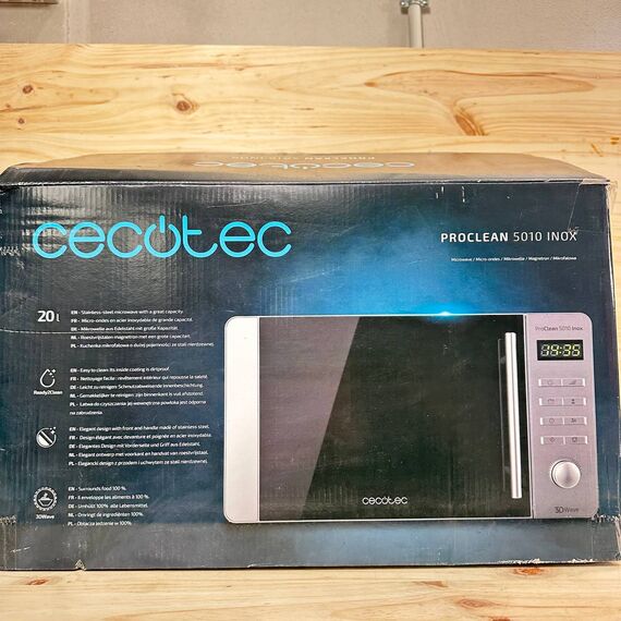 Microondas Cecotec ProClean 5010 de 700W (nuevo, sin defectos). Cuenta con una capacidad de 20L y un revestimiento Ready2Clean que facilita su limpieza. Dispone de 5 niveles de funcionamiento y 8 programas automáticos, además de la innovadora tecnología 3DWave para una cocción uniforme.