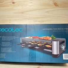 "Grill Cecotec Raclette Cheese&Grill 16000 Inox de 1400 W. Estado bueno. con una abolladura en la base metálica. Superficie mixta de 40 x 22 cm. Incluye 8 sartenes y espátulas. "