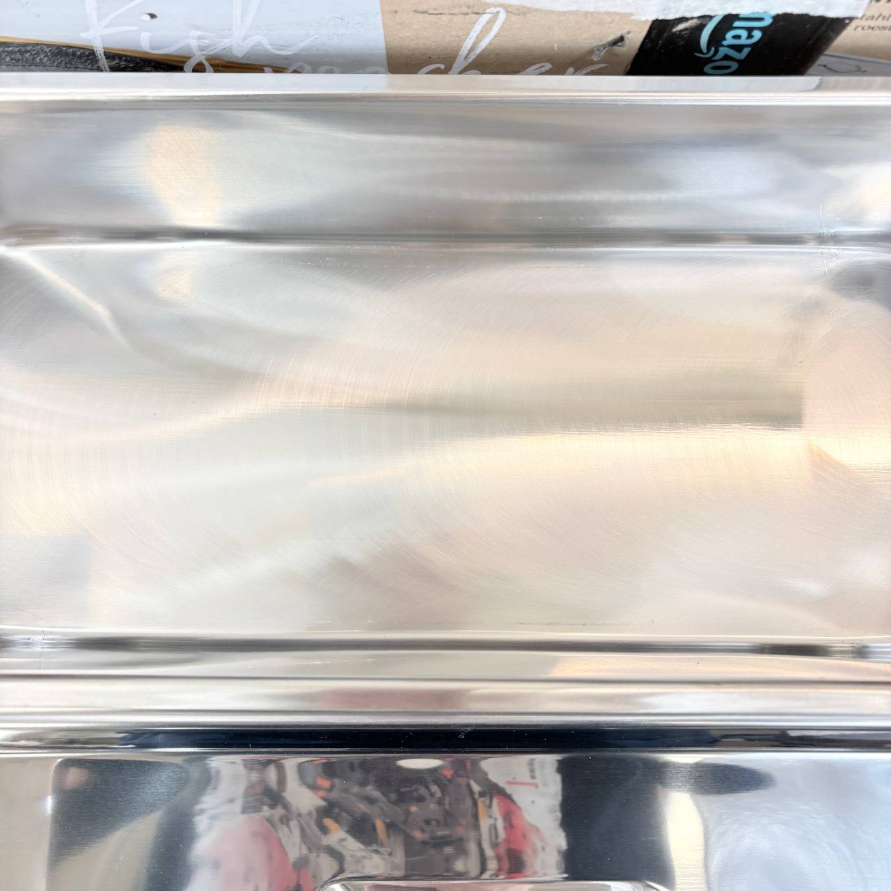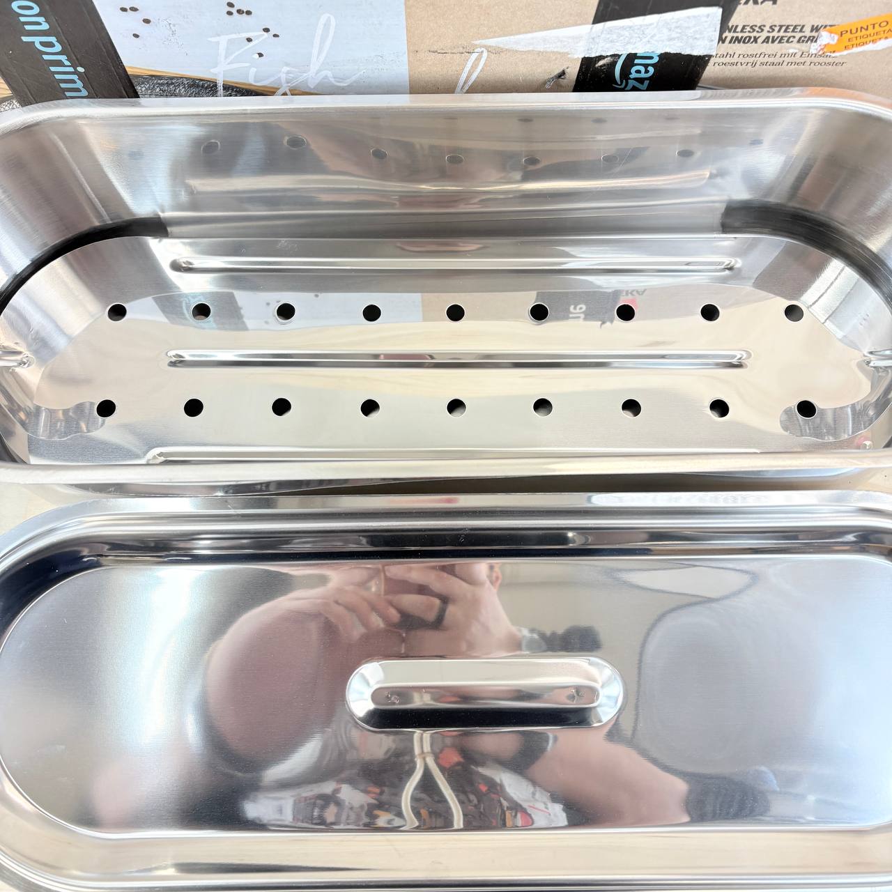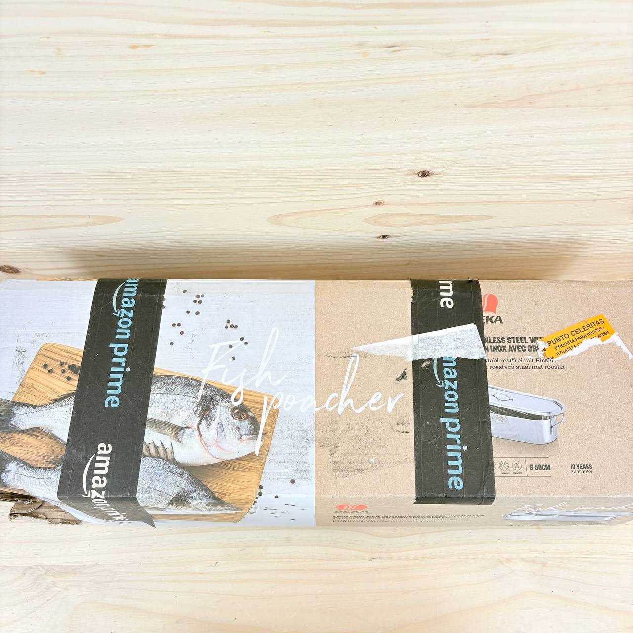 Fuente Beka de acero inoxidable de 50 cm para asar pescado con tapa y rejilla (nuevo, pequeño detalle: caja original deteriorada). Fabricada en acero de alta calidad, es resistente y duradera, ideal para una cocción uniforme.