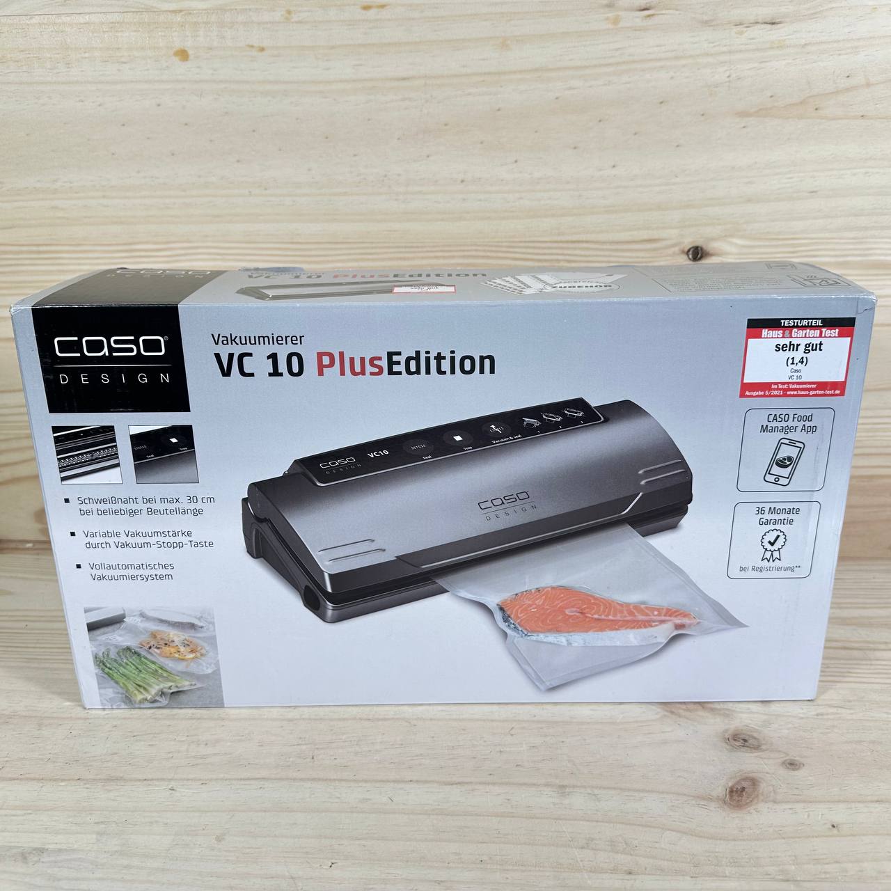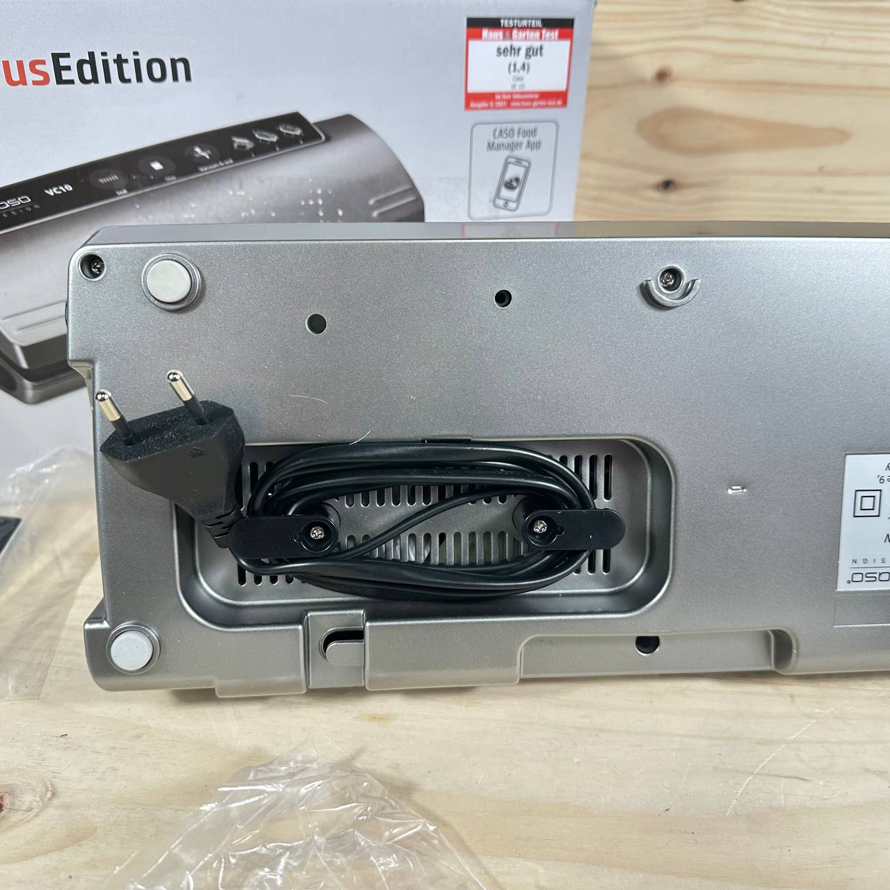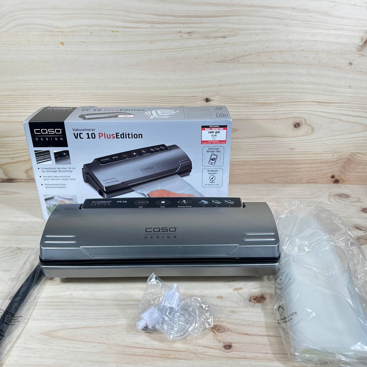 Envasadora al vacío CASO VC 10 Plus Edition en buen estado (sin defectos). Esta máquina compacta permite soldaduras de hasta 30 cm de ancho y es ideal para conservar alimentos. Incluye 50 bolsas CASO y cuenta con una aplicación gratuita Food Manager para facilitar su uso.