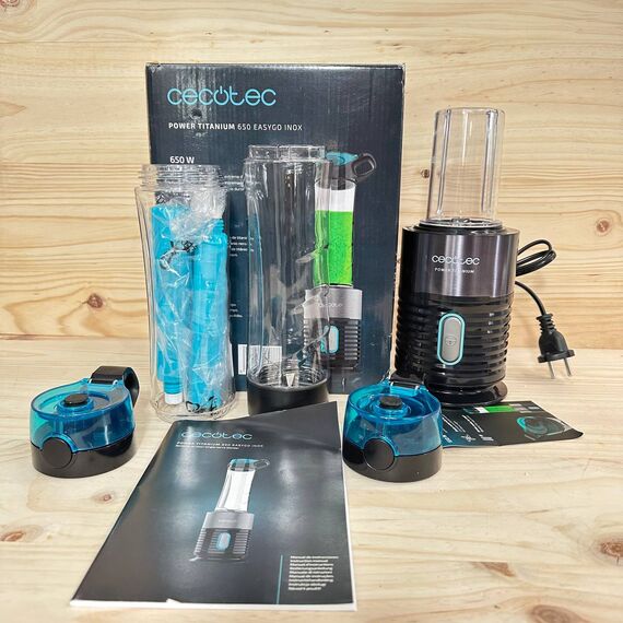 Batidora de Vaso Individual Cecotec Power Titanium 650 EasyGo Inox (nuevo, sin defectos). Potente motor de 650W y cuchilla de 4 hojas con recubrimiento de titanio negro, ideal para una mezcla perfecta. Incluye 2 tubos refrigeradores y 2 vasos resistentes de 600ml.