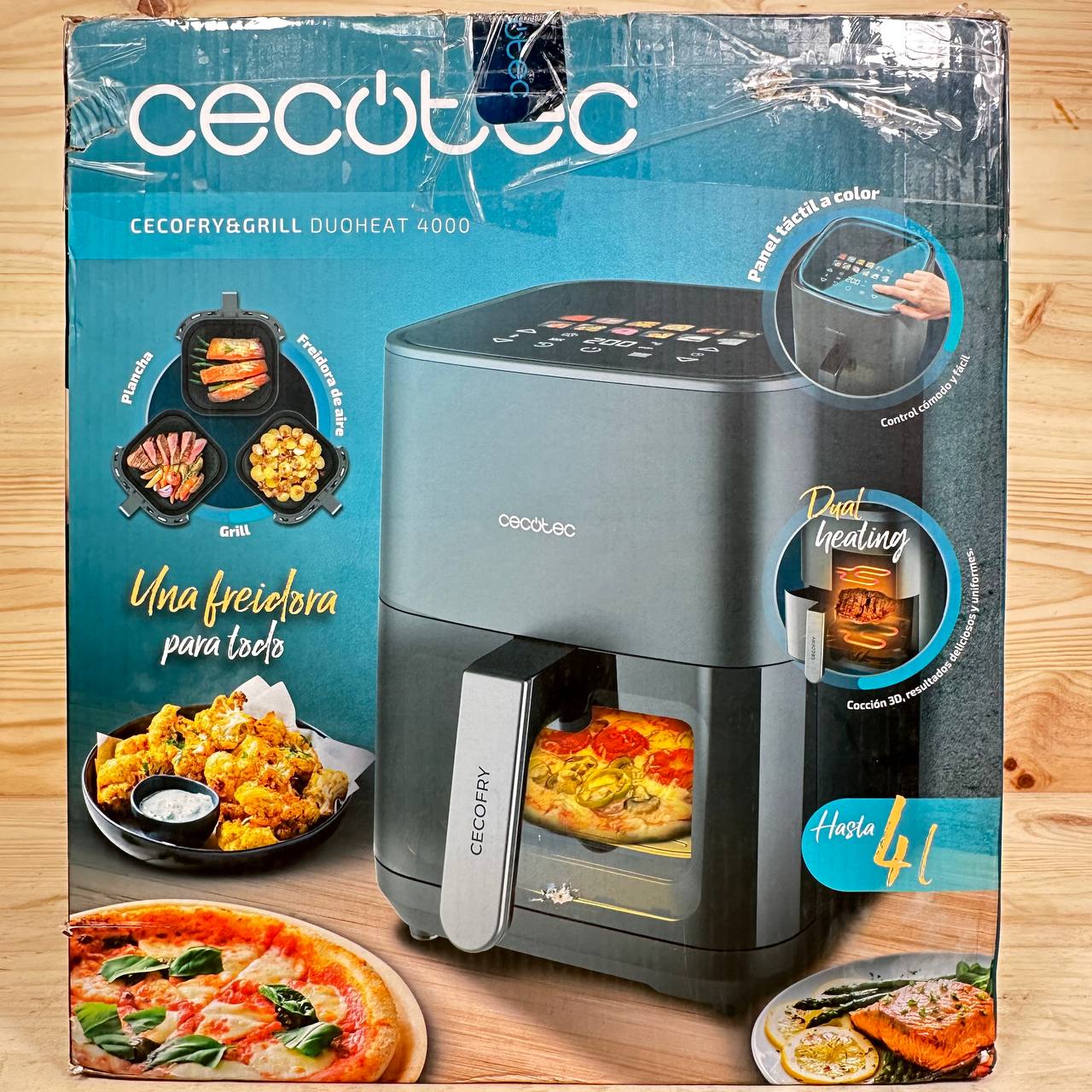 Freidora de Aire Cecotec Cecofry&Grill Duoheat 4000 (como nueva, sin defectos). Potente con 1900W y capacidad de 4L, cuenta con doble resistencia y pared divisoria móvil para cocinar diferentes alimentos al mismo tiempo. Temperatura regulable de 40 a 200°C y 10 menús preprogramados.