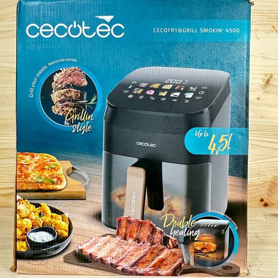 Freidora de Aire Cecotec Cecofry&Grill Smokin' 4500, 4,5L, en estado como nuevo y sin defectos. Potente con 1900W, cuenta con doble resistencia y ahumador integrado, además de una temperatura regulable de 40-200°C y 10 menús preconfigurados.