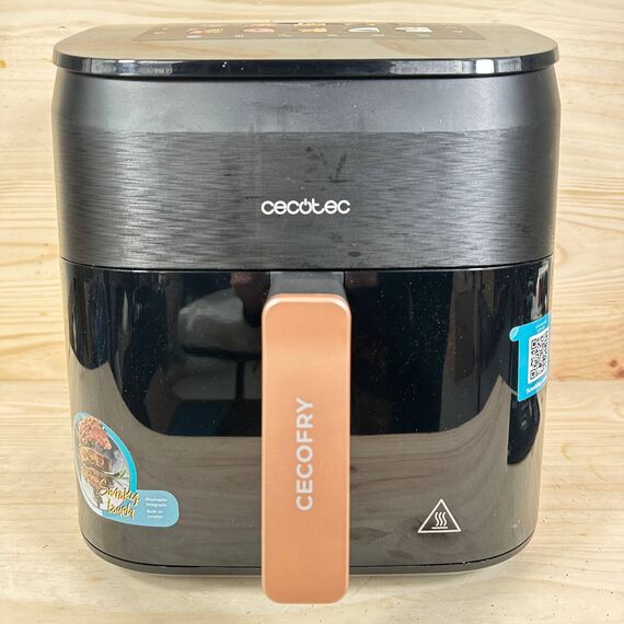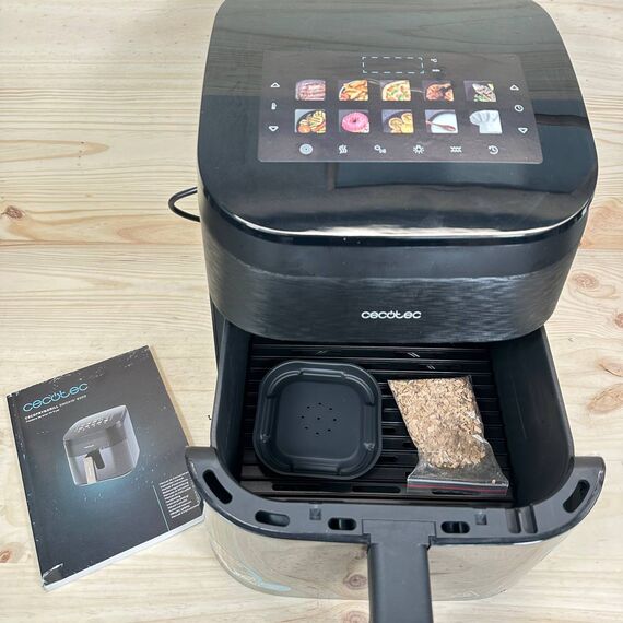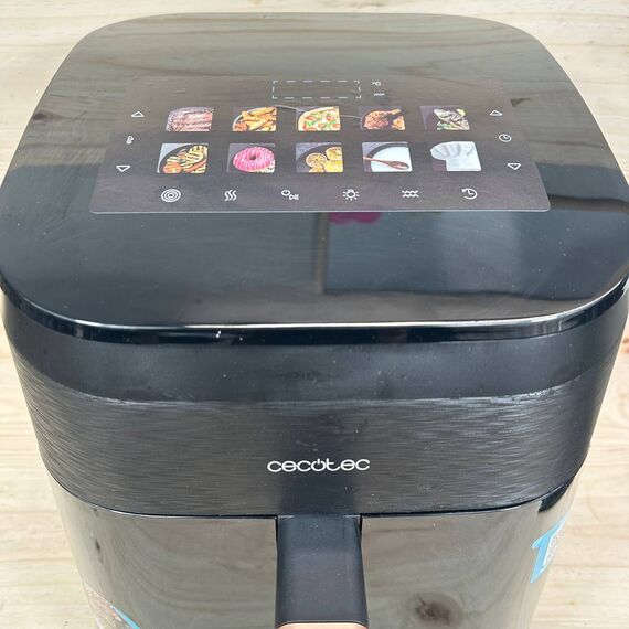 Freidora de Aire Cecotec 6,5L Cecofry&Grill Smokin' 6500 (como nuevo, sin defectos). Potente con 2200W, cuenta con una capacidad de 6,5 litros y una temperatura regulable de 40 a 200°C. Incluye 10 menús preestablecidos para facilitar la cocción.
