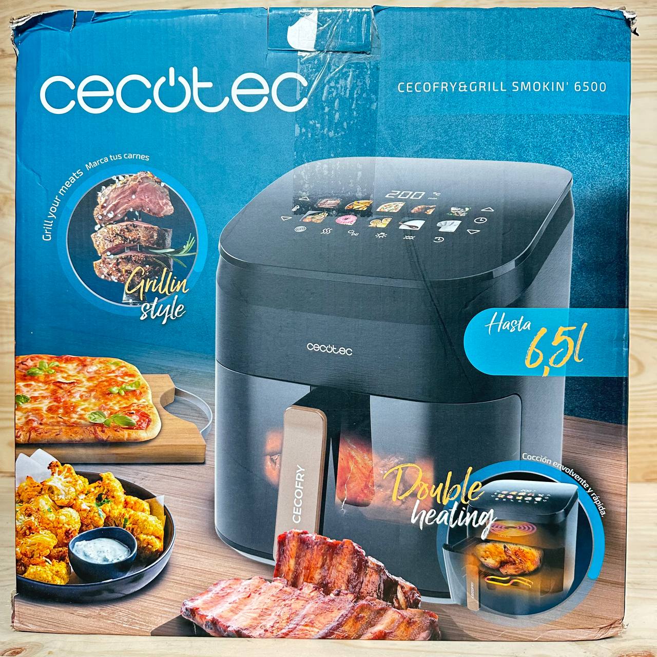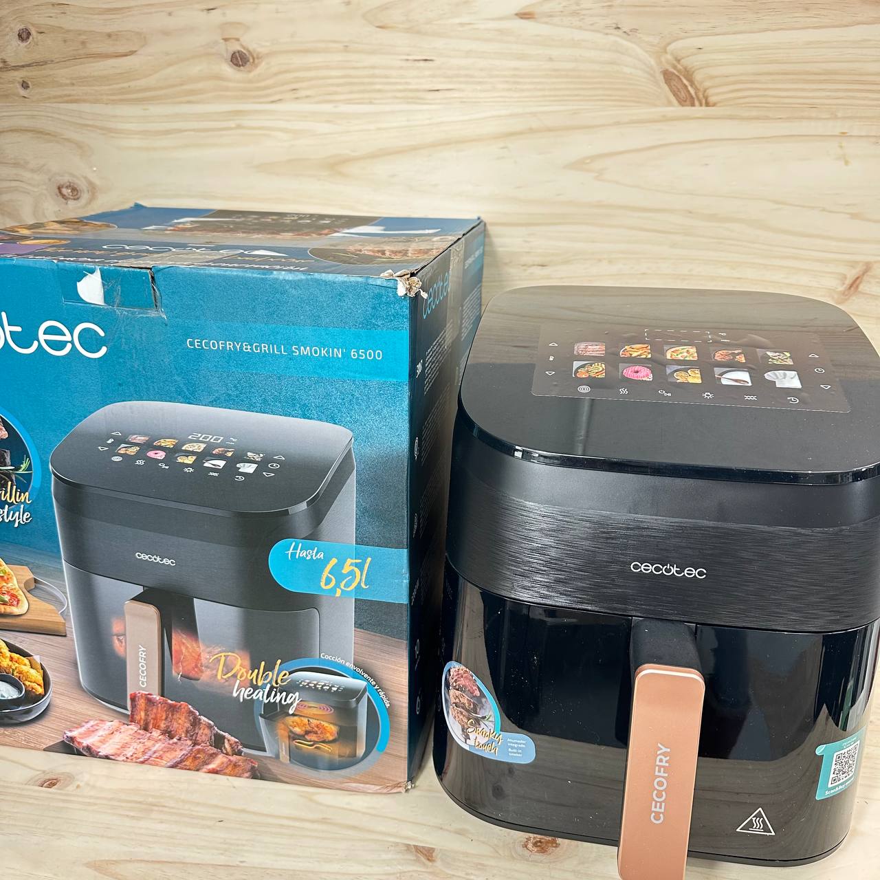Freidora de Aire Cecotec Cecofry&Grill Smokin' 6500, 2200W (como nuevo, sin defectos). Capacidad de 6,5L, con plancha grill de doble resistencia y ahumador integrado. Temperatura regulable de 40 a 200°C y 10 menús preestablecidos.