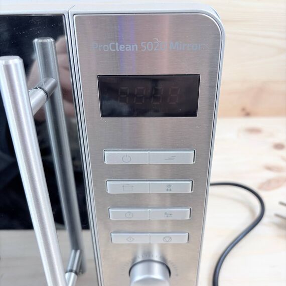 Microondas Cecotec ProClean 5020 Mirror de 700 W (como nuevo, pequeño detalle: sin caja original, golpe en la carcasa, pequeñas marcas de uso). Capacidad de 20 L con revestimiento Ready2Clean para una limpieza sencilla y tecnología 3DWave para una cocción uniforme.