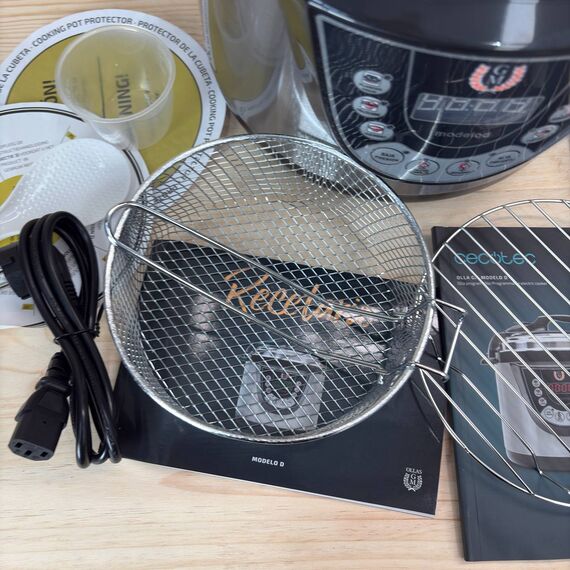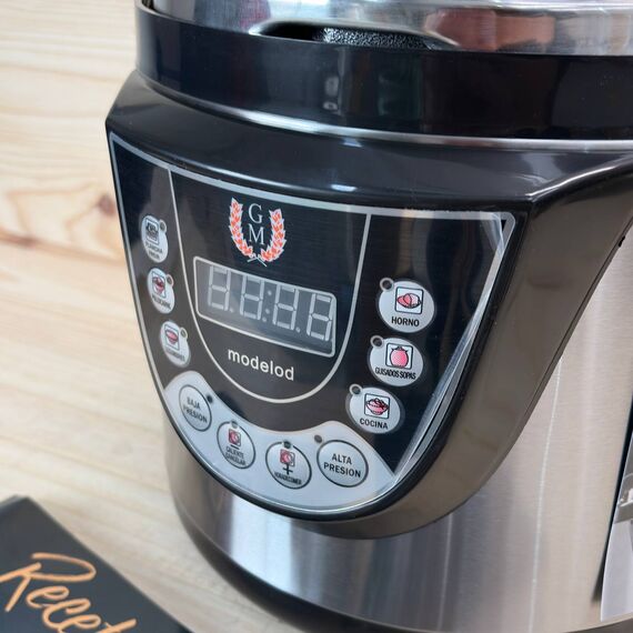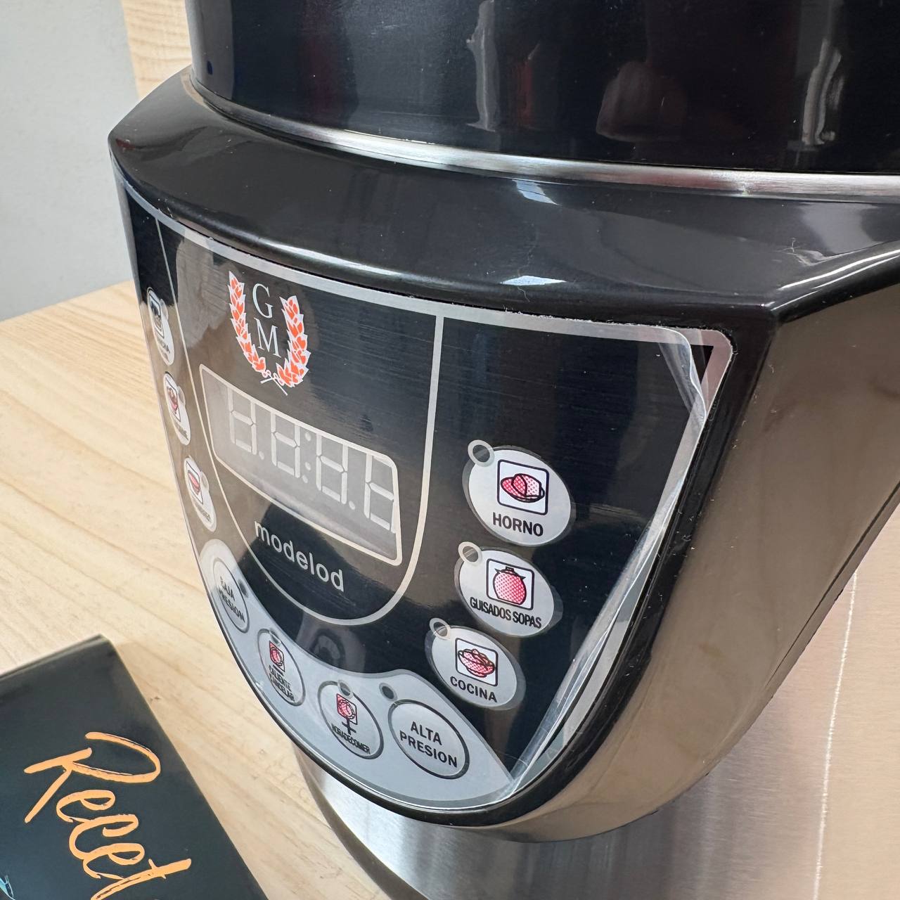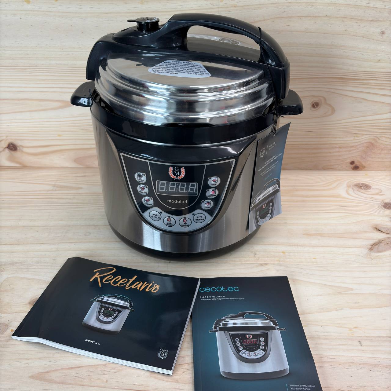 Olla Eléctrica Programable Cecotec GM Modelo D de 6L (nuevo, pequeño detalle que no afecta funcionamiento). Cuenta con múltiples funciones, incluyendo cocción a presión, vapor, y guisos, ideal para preparar una gran variedad de platos.