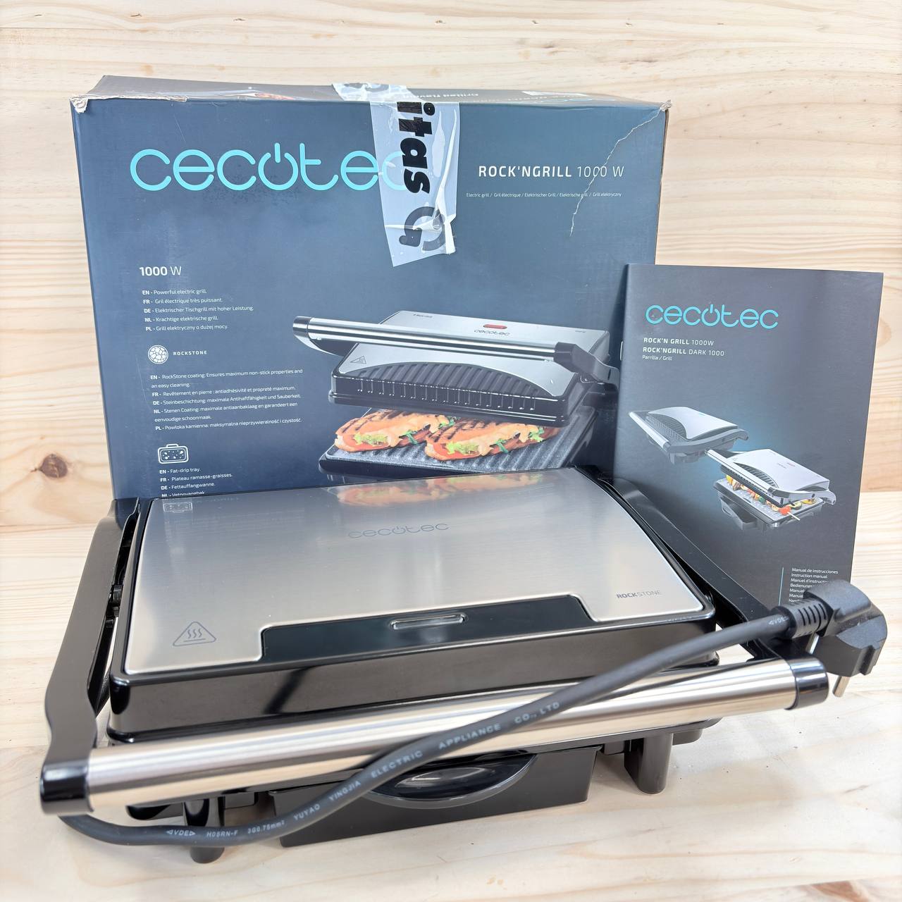 Parrilla Eléctrica Cecotec Rock'nGrill 1000 (como nuevo, sin defectos). Potencia de 1000 W con revestimiento antiadherente RockStone, ideal para una cocción saludable. Dimensiones de 25.5 x 29.5 x 10 cm.