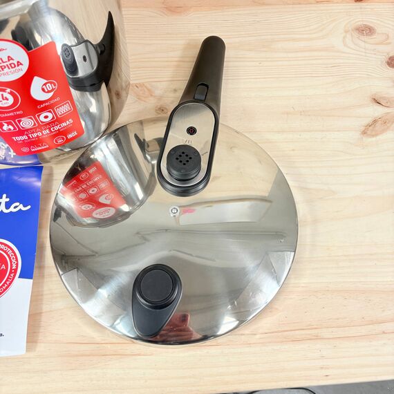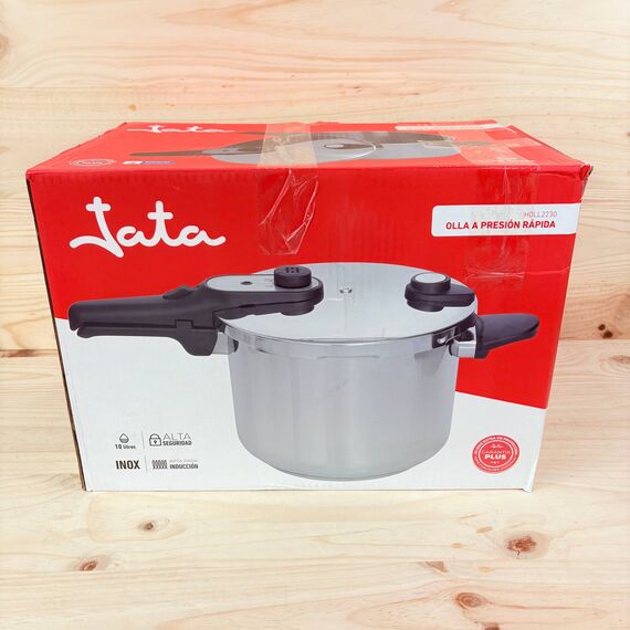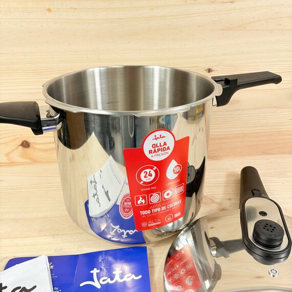 Olla a Presión Rápida Jata HOLL2230 de 10 litros, estado nuevo, sin defectos. Fabricada en acero inoxidable, cuenta con un diámetro de 24 cm y es apta para todo tipo de cocinas, incluida la inducción.