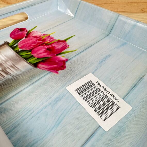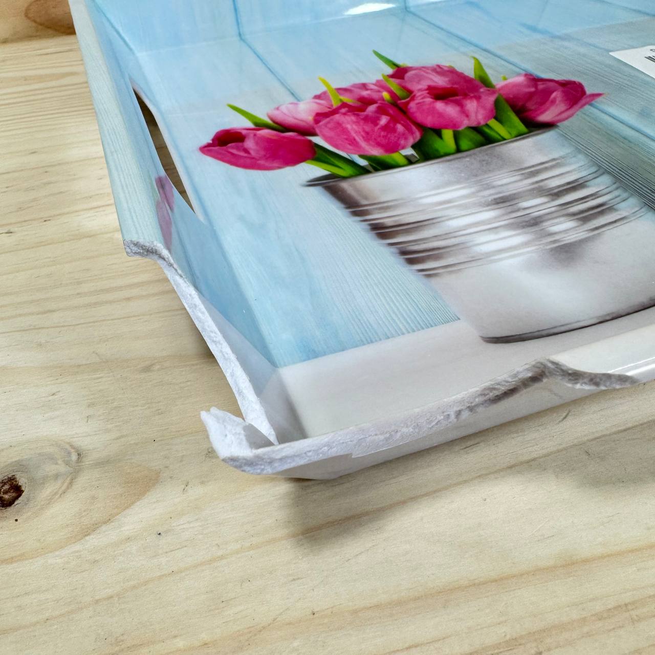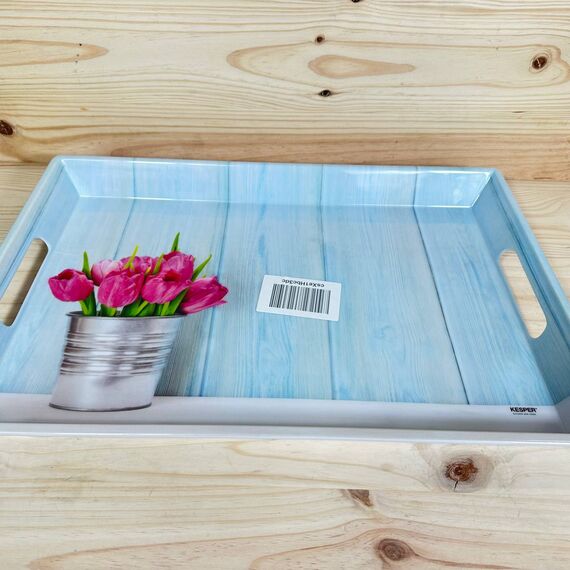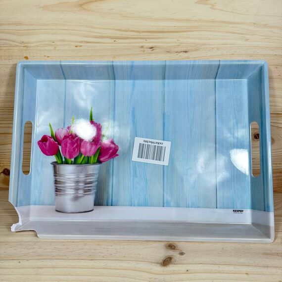 Bandeja de servir KESPER, modelo 77392, en buen estado (pequeño detalle: una esquina rota que no afecta su uso). Dimensiones de 50 x 35 x 4,5 cm, con un atractivo diseño de tulipanes que aporta un toque floral a tus presentaciones.