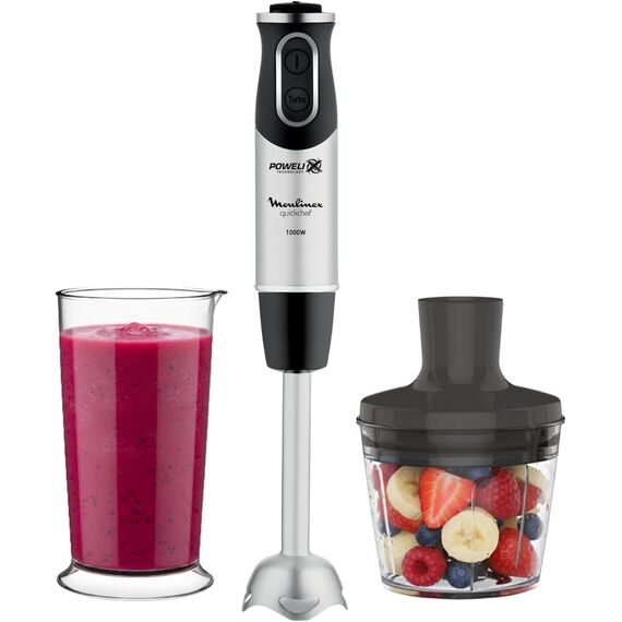 Moulinex QuickChef, Batidora de Mano de 1000 W, con Regulador de 10 Velocidad Turbo con 2 Accesorio para Picar, picadora y vaso Medidor, Cúpula Antisalpicaduras, Acero DD6578