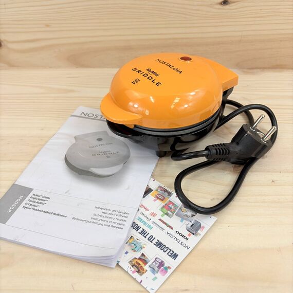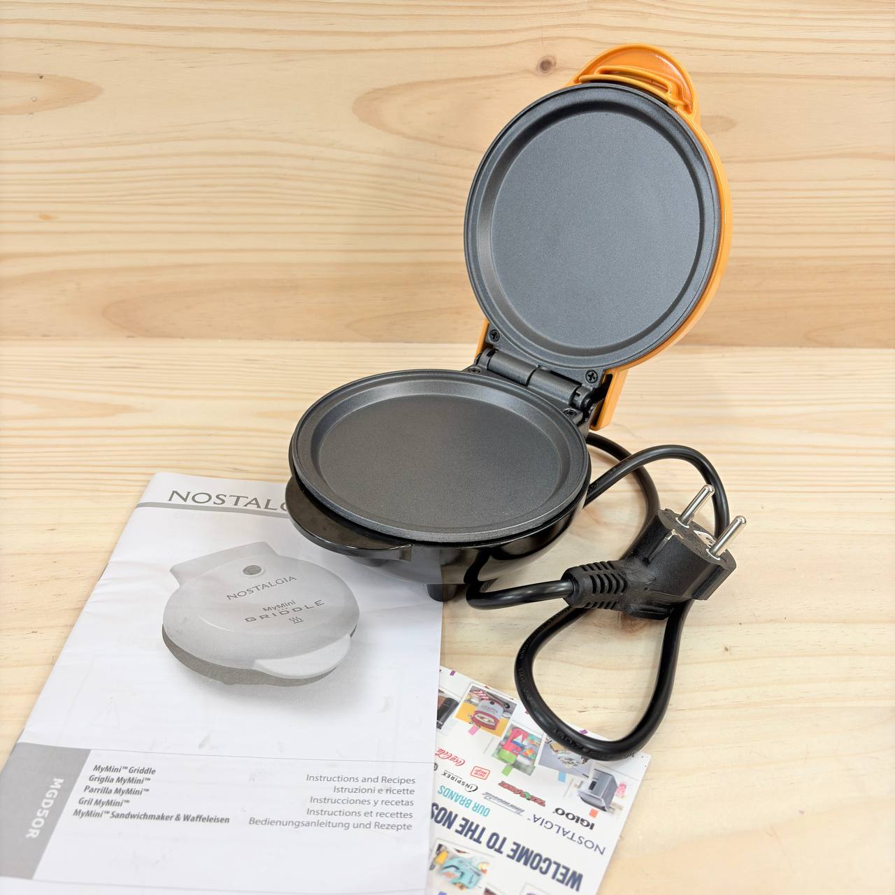Plancha eléctrica personal Nostalgia MGD5OR, nueva, nunca usada (pequeño detalle: sin embalaje original). Ideal para preparar huevos, tortillas, panqueques, sándwiches de desayuno, quesadillas y galletas.