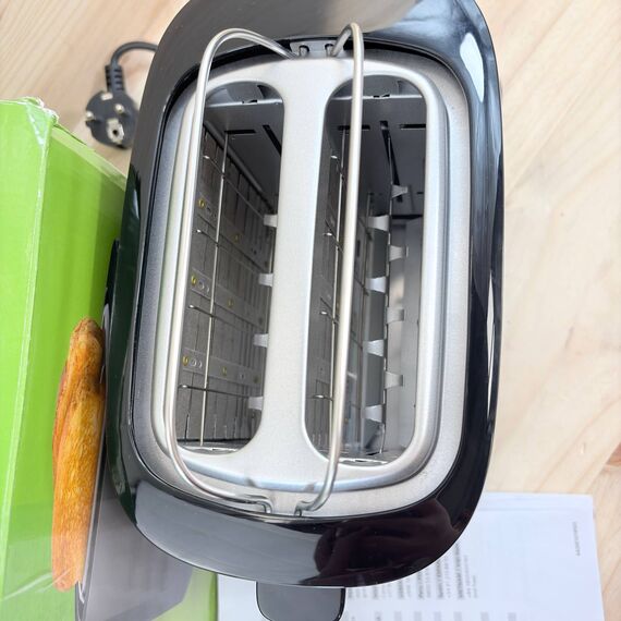 Tostadora Philips Daily Collection HD2581/90, en color negro (nuevo, sin defectos). Cuenta con 2 ranuras y 8 opciones de ajuste para un tostado perfecto. Incluye rejilla calientabollos, función de descongelación y elevación alta para mayor comodidad.