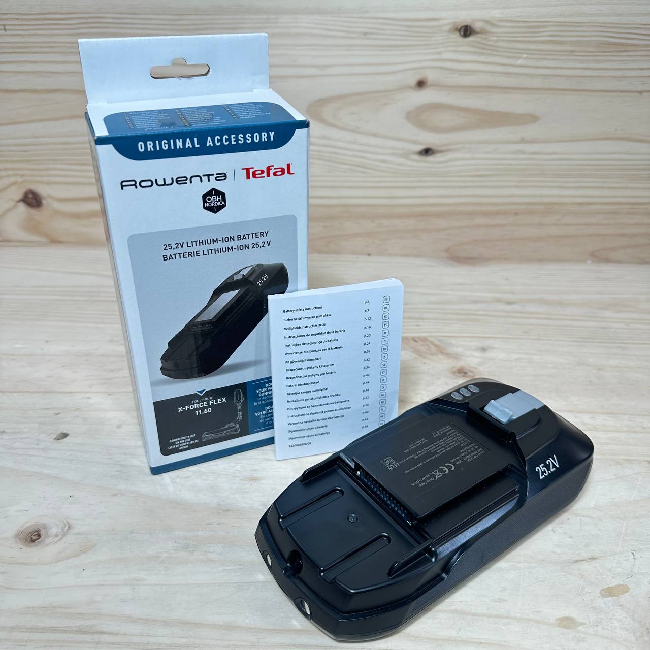 Batería Rowenta de iones de litio ZR009701 X-Force 11.60 (como nuevo, sin defectos). Con una potencia de 25,2 voltios, ofrece 45 minutos adicionales de experiencia de succión. Compatible con los modelos X-Force Flex 11.60 RH98, TY98 y EO98, en colores negro y gris.