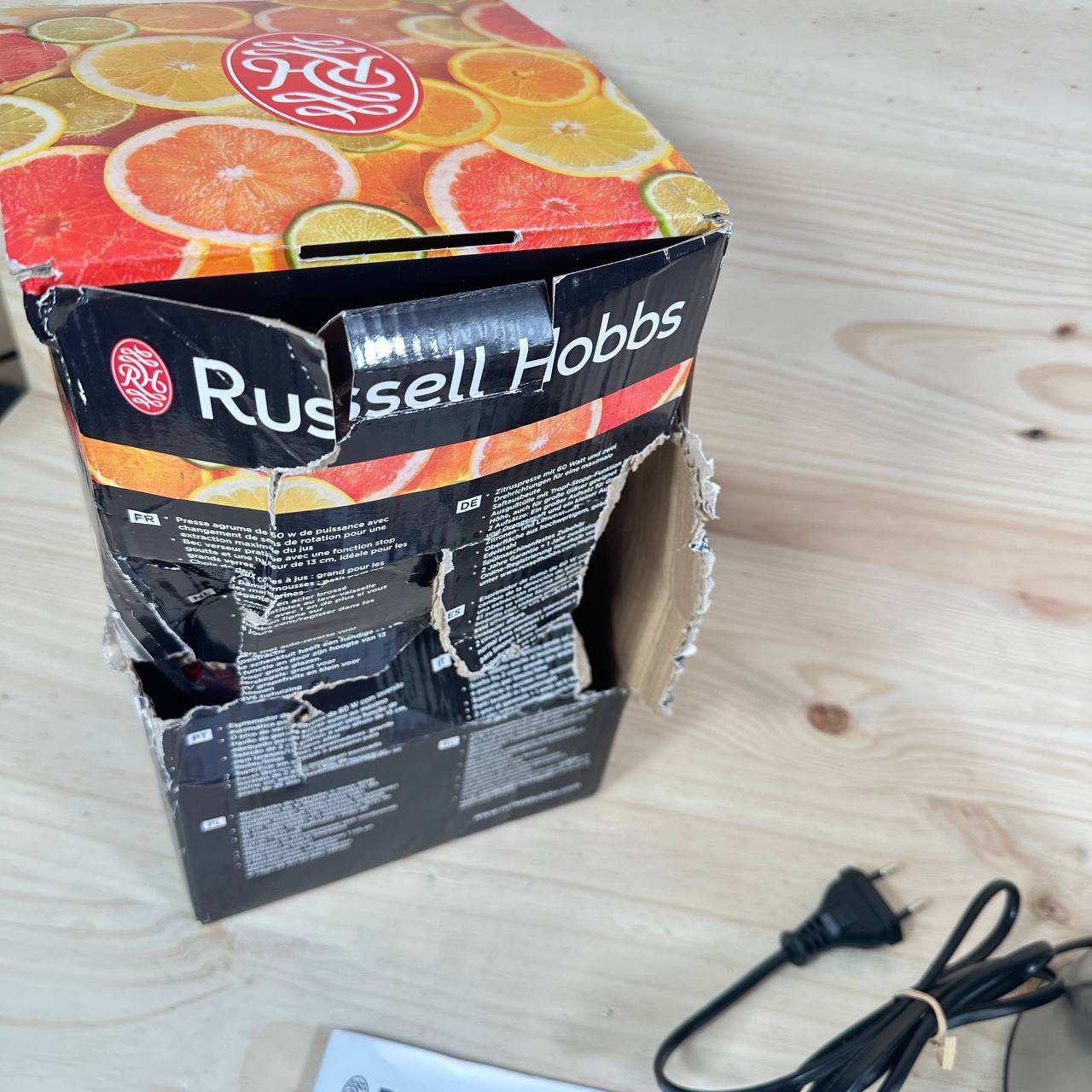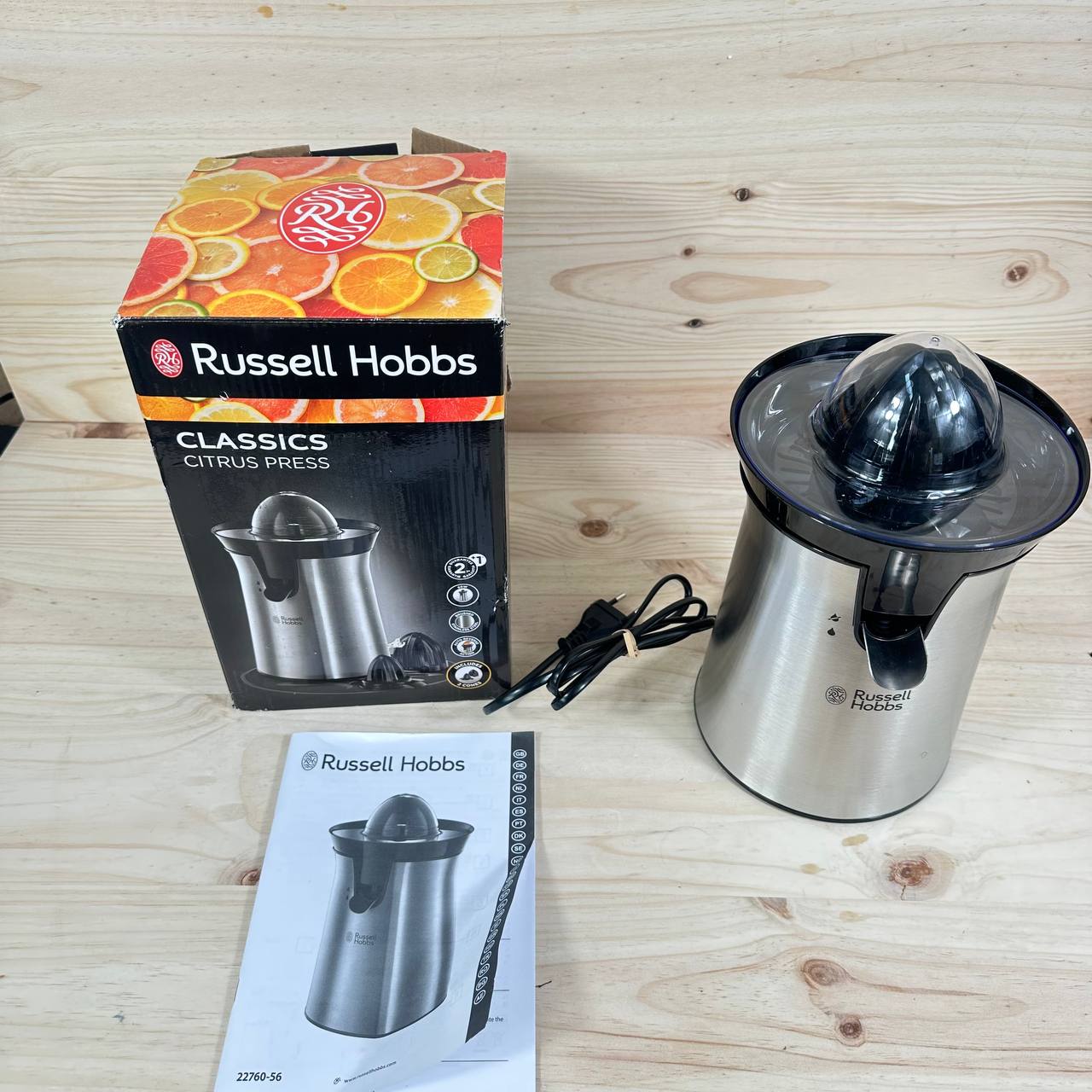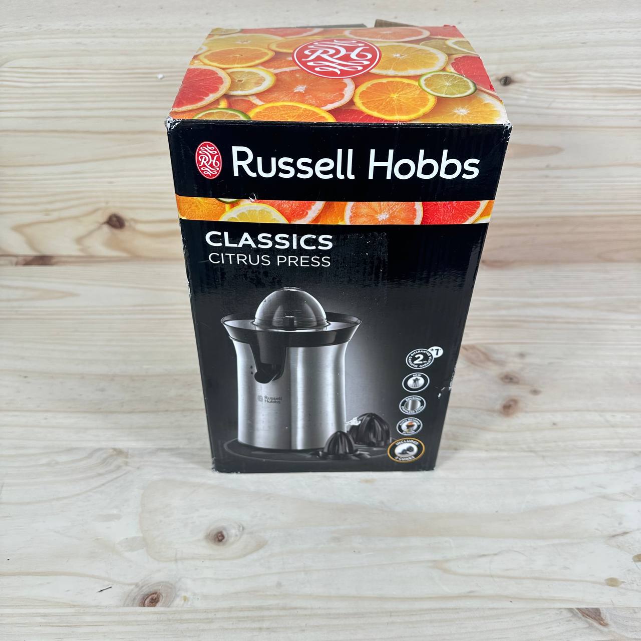 Exprimidor de Zumo Eléctrico Russell Hobbs 22760-56 en color acero inoxidable/gris (buen estado, pequeño detalle: caja original muy dañada). Cuenta con un potente motor de 160W y un diseño elegante que se adapta a cualquier cocina.