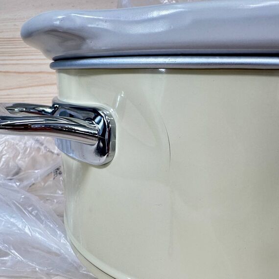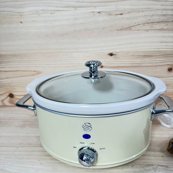 Olla de cocción lenta Swan Retro SF17021CNEU de 3,5 litros (nuevo, pequeña abolladura y arañazo en un lateral que no afectan funcionamiento). Cuenta con un recipiente extraíble, recubrimiento antiadherente y es libre de PFOA y PTFE. Dispone de 3 niveles de temperatura y tapa de vidrio.