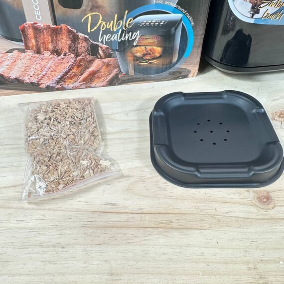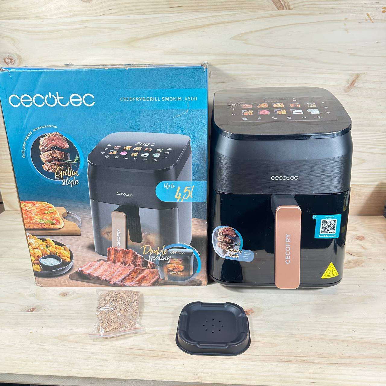 Freidora de Aire Cecotec Cecofry&Grill Smokin' 4500 de 1900W (como nuevo, sin defectos). Capacidad de 4,5L, con plancha, grill y ahumador integrado. Temperatura regulable de 40-200°C y 10 menús preestablecidos.
