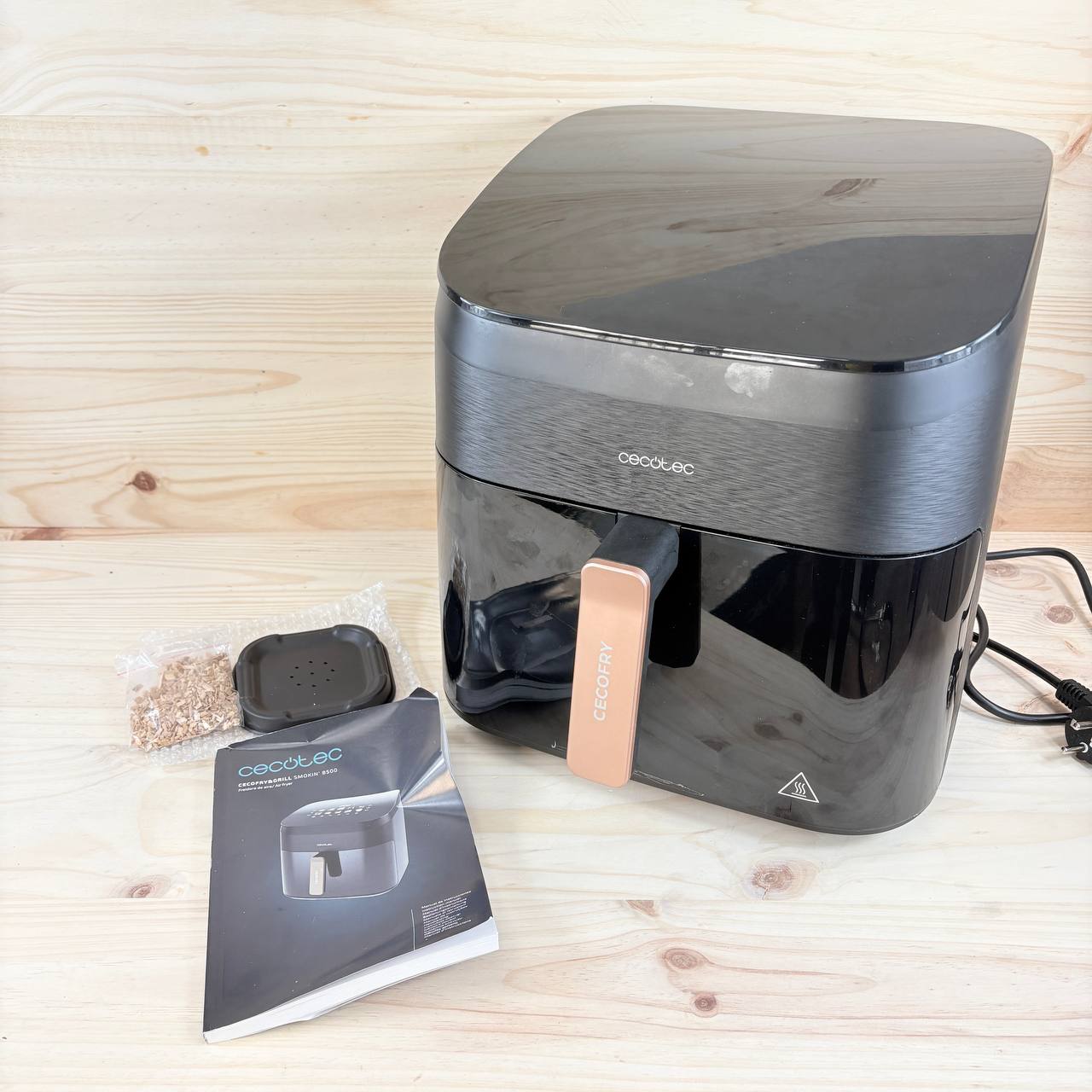 Freidora de aire Cecotec Cecofry&Grill Smokin' 8500 de 2200W (como nuevo, pequeño detalle: marcas de uso). Capacidad de 8,5L, plancha y grill con doble resistencia y ahumador integrado. Temperatura regulable de 40-200°C y 10 menús preestablecidos.
