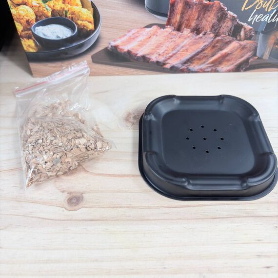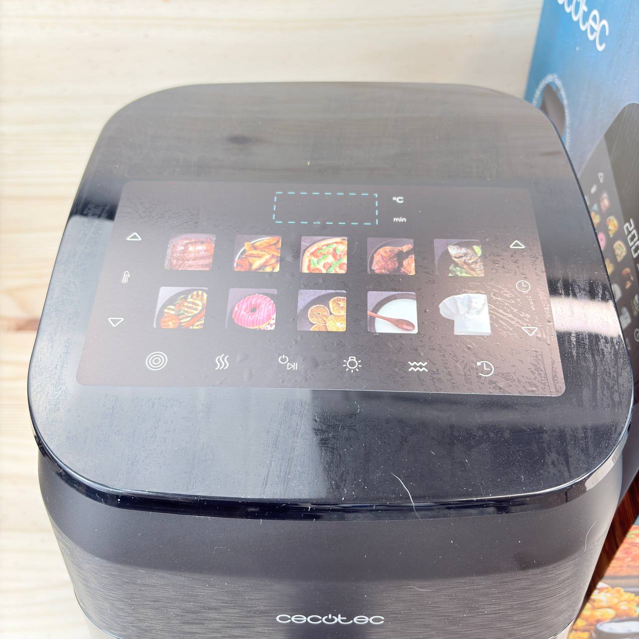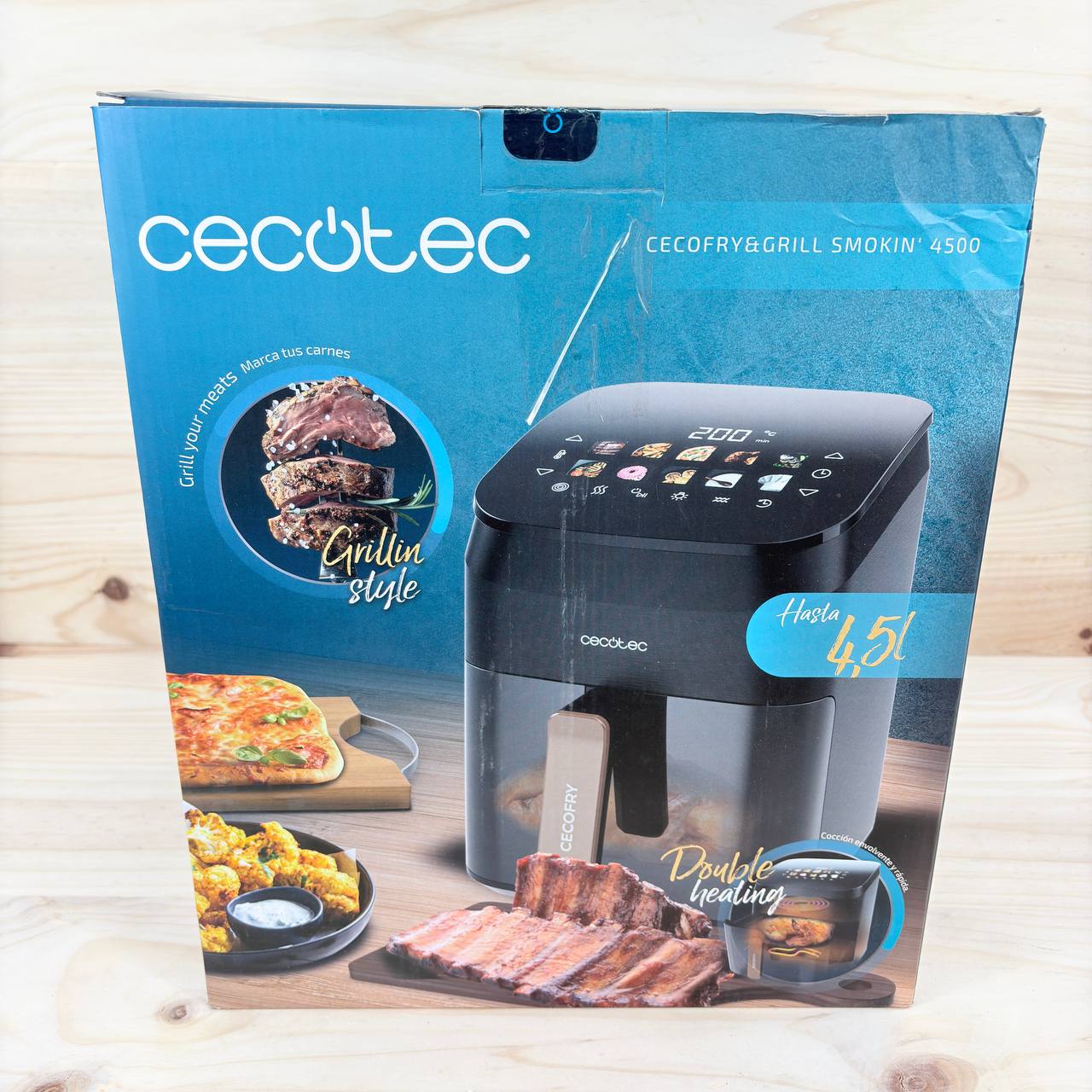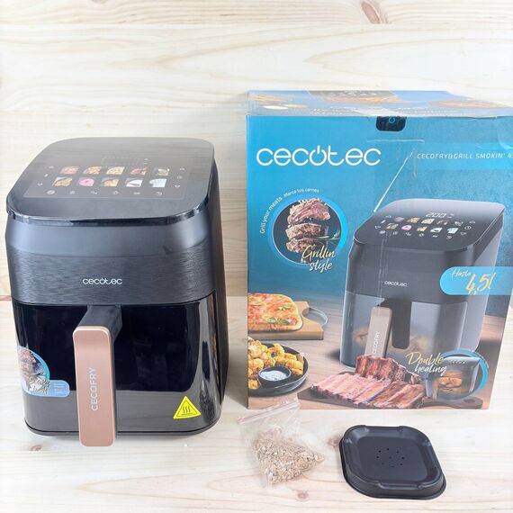 Freidora de Aire Cecotec Cecofry&Grill Smokin' 4500, 4,5L, como nueva, sin defectos. Potente motor de 1900W con temperatura regulable de 40 a 200°C y 10 menús preestablecidos para cocinar de manera fácil y rápida.