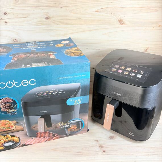 Freidora de Aire Cecotec Cecofry&Grill Smokin' 8500 de 2200W (como nuevo, leves marcas de uso). Capacidad de 8,5L con plancha y grill, doble resistencia y ahumador integrado. Temperatura regulable de 40-200°C y 10 menús preestablecidos.
