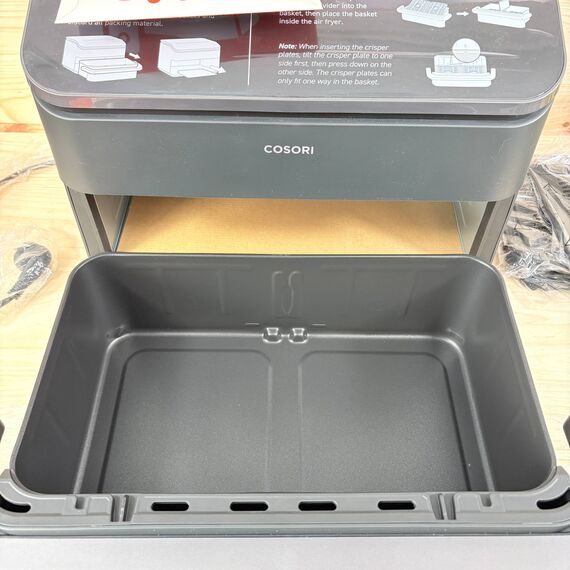 Freidora de Aire Cosori Dual Blaze TwinFry de 10 Litros (nuevo, sin defectos). Cuenta con una potente doble resistencia de 2800 W y un rango de temperatura de 35 a 240 °C. Incluye un divisor para zonas en la gran doble cesta, ideal para cocinar diferentes alimentos simultáneamente.